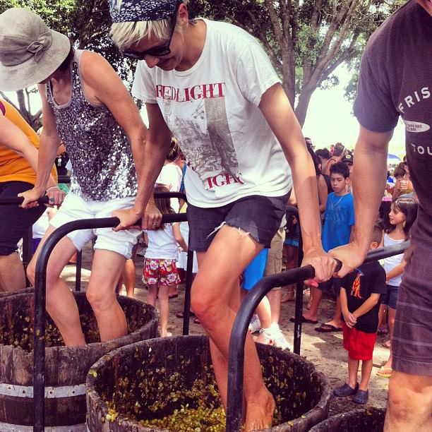 Plastic cups of wine in hand, Jenn and I got in line for the grape stomping. The fruit’s sticky remains covered every surface, and green and blue bottle flies buzzed erratically around us as a fecund, musty smell arose from the vats we were waiting to enter. The muscadine grapes grown at Lakeridge bear little resemblance to the green and red grapes one finds at the supermarket. Muscadines have a thicker, tougher skin and the juice and fruit within is particularly slick and syrupy. As I began to squish them underfoot, I found they didn’t simply turn to mush and liquid upon contact. Instead, they resisted the pressure and then popped, leaving their viscous texture clinging to my feet and ankles. There was no mistaking that I had actually crushed a solid entity beneath my bare feet. Thick bits of grape skin stuck between my toes and a sheen that bore a closer similarity to mucous than juice clung to my calves as I walked through the dirt to the hose where we washed up. I was keenly aware that the grasshoppers bounding this way and that likely found their way into the vats on more than one occasion. There was something gross about the whole experience, almost repulsive and at the same time so delightful I wanted to do it again as soon as possible.