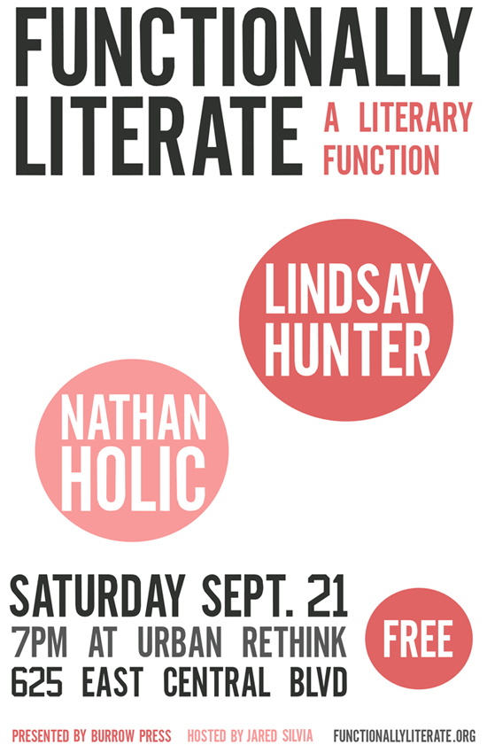 On this week’s show, I share the latest installment of Functionally Literate, the reading series hosted by Jared Silvia, and this time featuring Nathan Holic and Lindsay Hunter!