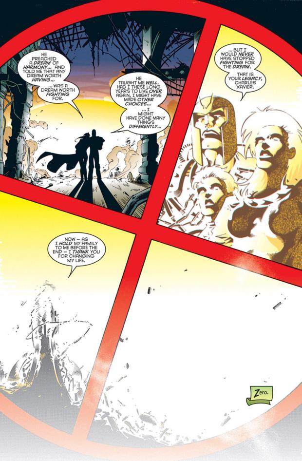 In the end, the X-Men succeed in putting the world back to normal. But the comic doesn’t end in victory, not really. It doesn’t end in the correct timeline with the X-Men happy at the mansion. It ends in the Age of Apocalypse world with Magneto, his wife Rogue, and their infant child as the bombs go off and the world is erased. The family stands there in hope that everything will be better and we watch them get engulfed in the fallout. Even in victory, there is tragedy.