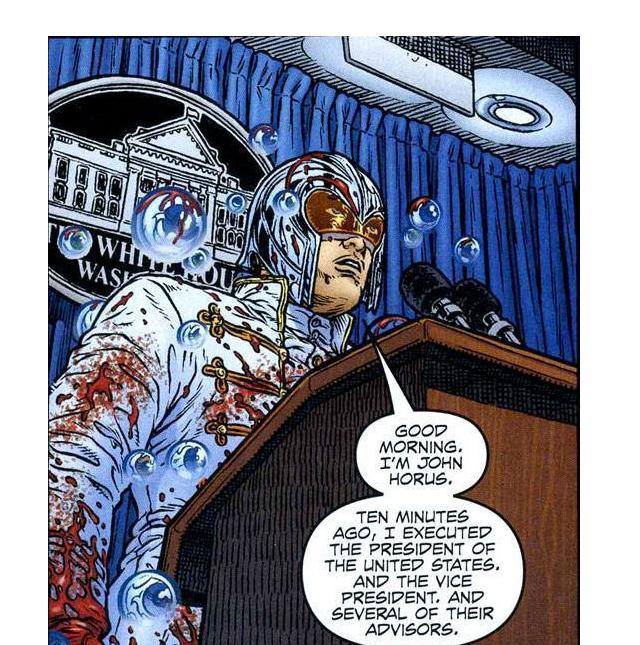 The eight-issue mini-series begins with one of the superheroes, John Horus, deciding that the U.S. government is corrupt and he kills the president. There are some mentions of real world events, like September 11, and it’s not difficult to see this comic, published in 2007 and 2008, as Ellis’s thoughts on the Bush administration. Before a press conference, Horus, dressed in white with the Eye of Providence, representing the eye of God, on his back, comes forward and takes responsibility for his actions. “I understand many of you will be afraid, right now. Please: This isn’t a terrorist act. This isn’t a coup. This is simply one man ending the freedom of criminals dangerous to the American spirit.” He goes on to say, “If you have a God, pray for me tonight. For I have done a terrible thing that will stay with me all my years, just to save you.” Ellis immediately brings up the question of whether there is such a thing as going too far for a superhero. If they must protect humanity, where does that end?
