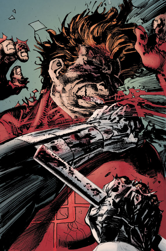 The next two pages feature a variety of panels showing the fight continue. Very little text is given to keep pacing up. On the top of page two, both characters stand beyond the panel’s confinement. The fight is like none before. They even break panel rules. Both characters are torn and bloody. The beaten Daredevil’s big defense is to throw a box poorly at Bullseye.