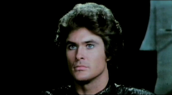 They travel to a planet of Amazon women whose queen can control giant statues that throw swords at people. Still, they find no massive weapon. They travel to another planet that’s an ice planet, and it’s on this planet that we learn that blue bald cop has been working for Count Zar Zan all along. Akton takes care of business and beats the tar out of the blue bald dude. The final planet they go to is a planet inhabited by troglodytes and they smash the robot cop to pieces leaving Stella Starr to be sacrificed or barbequed or something. The troglodytes get zapped by some dude wearing a gold mask that shoots lasers from his eyes. When the mask comes off, it’s none other than David Hasselhoff. Now that’s great cinema.