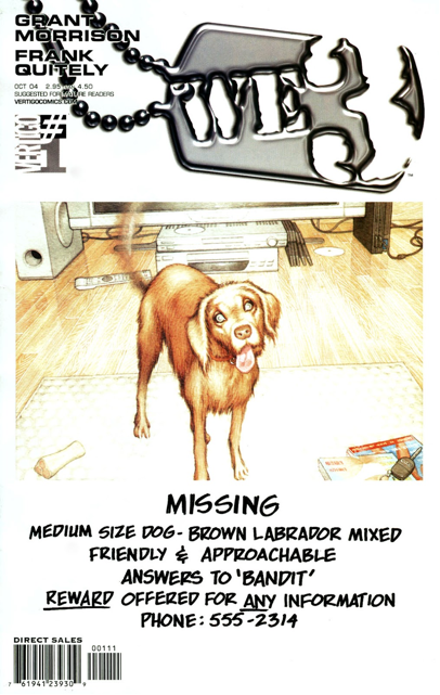 Over the next three weeks, I’m going to take a look at one of my favorite comics from the 2000s, We3 by Grant Morrison and Frank Quitely. We3 can’t exist in another medium—at least, it would have to change quite a bit. It’s about three animals (dog, cat, and rabbit) who are put in robotic suits by the military for research. The military is going to shut down the program, so the doctor who cares for the animals lets them loose. The military goes after them. When it was released a decade ago, it was described as Homeward Bound meets Terminator. It’s extremely violent, with very little dialogue. And there’s barely a plot. Basically, I described everything that happens, minus the ending, already. It’s mostly a showcase for Frank Quitely’s artwork.