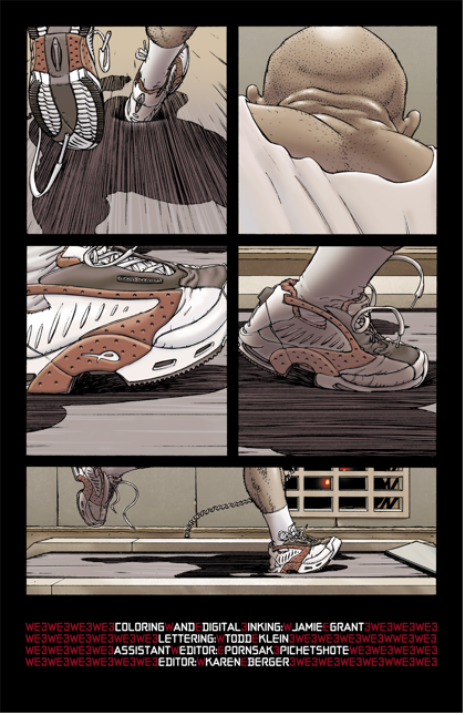 When I say We3 is focused on the art, I don’t mean to say the comic has very detailed art that gives the reader something pretty to look at. It has that, but Quitely is also focused on how the comic presents such pictures, in the service of a story.