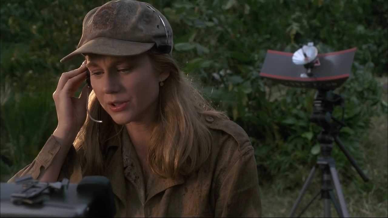 Dr. Karen Ross (Laura Linney) is a communications scientists who works for TraviCom, TraviCom is run by R.B. Travis (Jo Don Baker). He’s obsessed with getting his hands on a rare blue diamond so he can build a super satellite like the kind we see in James Bond movies. He sends his son, Charlie Travis (Bruce Campbell), off to Zaire where he mysteriously disappears (gets mutilated by killer gorillas.) Charlie was Dr. Ross’s ex-fiancé so that’s her motivation for leading the exhibitio. R.B. Travis simply wants to rule the telecommunications industry. That’s his reason for sending the exhibition.