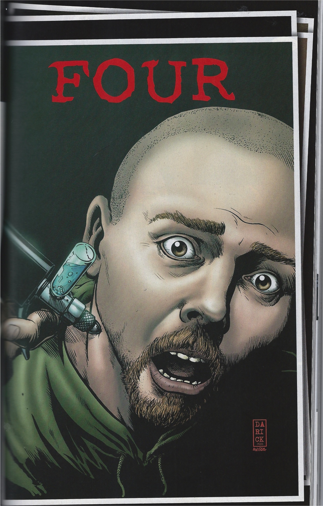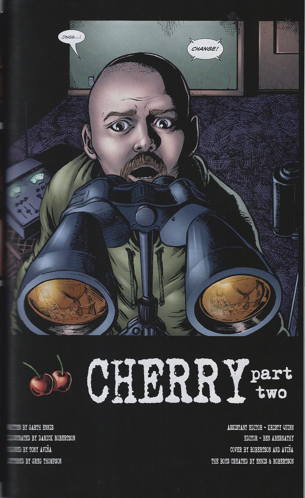 In the opening of issue four, Hughie watches from across the street as Teenage Kix runs through the whorehouse. He can see through all nine windows, and readers can too. Also, in a short amount of space, readers can be given a whole lot of specific details. Take the single panel featuring Teenage Kix member Gunpowder. He lies on his stomach on a bed, hands tied to the headboard. His helmet is one, but his pants are around his ankles. His back is covered in cuts as a woman whips him. Okay, enough detail to understand his depravity, but then Robertson and Ennis take it a step further. The woman whipping him is topless and smoking a cigarette. She’s not even looking at Gunpowder. In fact, her eyes give away that she’s either bored or dead inside. Then, there’s a second woman off to the side near Gunpowder’s ankles with gloves on, but otherwise naked. She’s pouring lube on a pistol. This panel is one of five on a page. It’s a lot of detail packed into a small area.