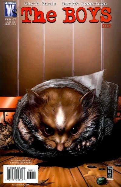 Because the fight is short, the comic has room for another conversation between Butcher and Hughie for the climax of the issue. One the mysteries of the comic has been why Butcher has it in for the superheroes. Even Mother’s Milk wonders if some superheroes mean well, but Butcher just says, “Fuck ‘em.” Butcher admits to Hughie that a superhero raped and impregnated his wife. She was physically unable to hold the baby, and one night, the baby ripped through her stomach, killing her. Butcher beat the baby to death with a lampstand. He has a scar on his forearm from the baby’s heat vision. It’s a graphic and disturbing story, and it helps readers understand Butcher and why he does what he does. And that closes out the first volume. We see what Butcher and the other Boys can do and why they do it.