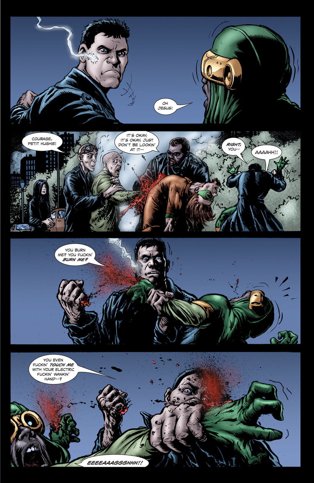 The second page features four panels, one for each of the other members of the Boys (Mother’s Milk, the Frenchman, the Female, and Hughie). The first three kick ass, with only Hughie on the run. He’s the newbie so it makes sense he has no idea what he’s doing. Hughie ends up coming face to face with Blarney Cock, who tries to cut out Hughie’s eyes. Hughie, who had been given a formula by Butcher to make him stronger so that he could take on superheroes, panics and just punches Blarney Cock in the stomach. His fist goes right through Blarney Cock, who stumbles a bit and falls over dead.