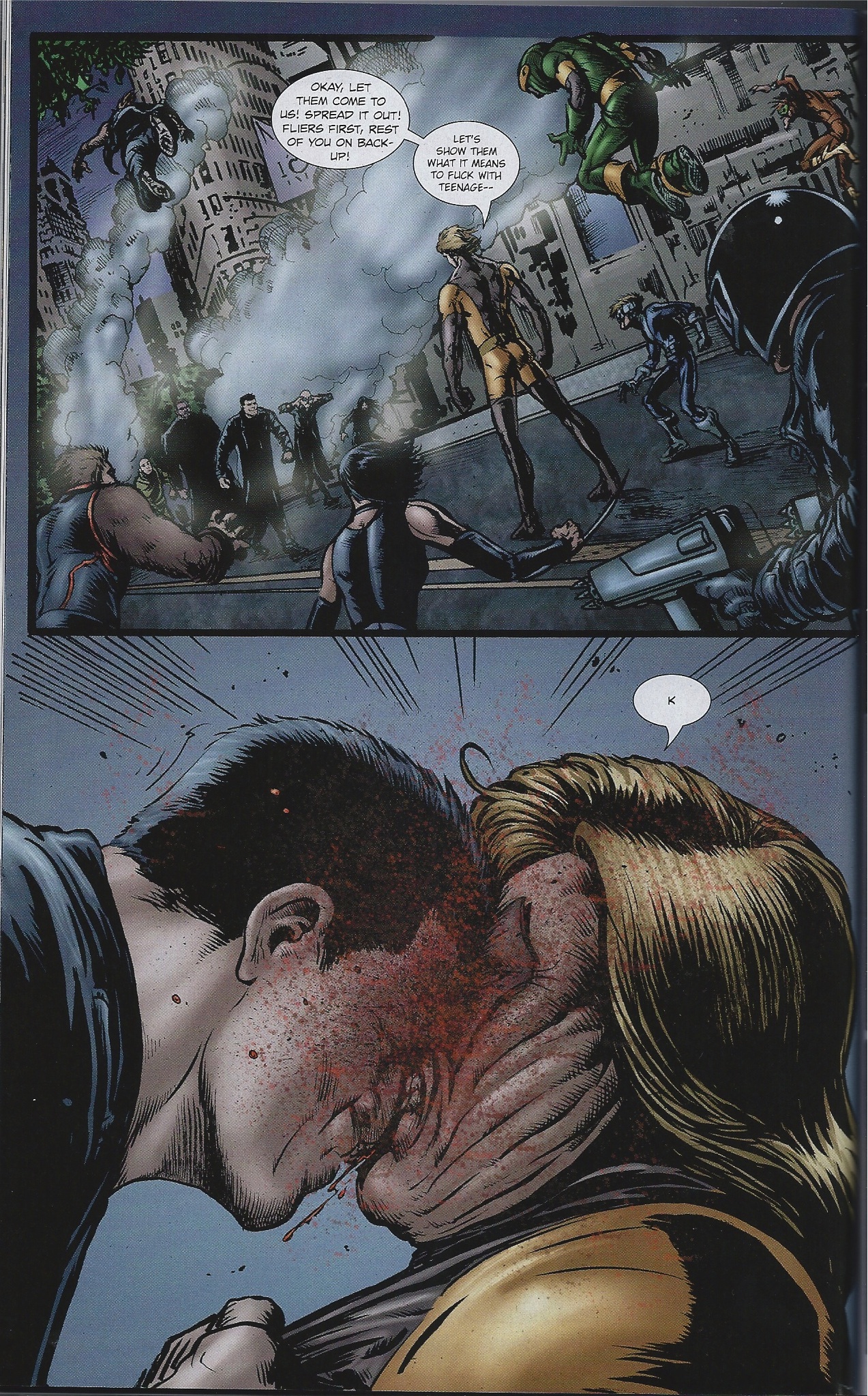 Big Game, the leader of Teenage Kix, begins with a big speech to his team about how to handle their enemy, but the Boys don’t need anything. They are skilled and trained at what they do and that happens to be kicking the ass of superheroes. Butcher head butts Big Game in the middle of his speech and breaks his nose. That’s the first page of the comic. Big Game’s speech, and Butcher breaking his nose. It’s sudden, brutal, and sets up how the fight will play out.