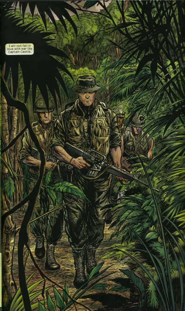 The Punisher, to me, is a romantic. Stevie Goodwin, one of the main characters in Born, says, “I will not fall in love with war like Captain Castle.” But, I don’t think Castle loves war. There is no joy when he’s gunning down Viet Kong. There is no joy when he allows a superior officer to go out on a hill where there is a known enemy sniper. I don’t think the Punisher feels joy. If the Punisher loved war, he would show emotion. He would show bloodlust. Stevie also states about Frank Castle that “his dedication to his men is total…Since he arrived, six months ago, not one patrol that he has led has suffered K.I.A.” Frank Castle doesn’t take risks just to fight the enemy. He is a man who refuses to accept that good and evil doesn’t exist, that there is no set right and wrong. He sees the world in black and white and will never see the grays. I believe that the Punisher believes he is sacrificing his own soul to fight for what is right. America is still good and right to him and the enemy must be stopped. After Vietnam, when his family is gunned down randomly on a picnic, he snaps. His mind can’t handle the idea of randomness. The good triumph and the bad are punished. Vietnam is the perfect backdrop for him. It’s what’s been missing from the film adaptations.