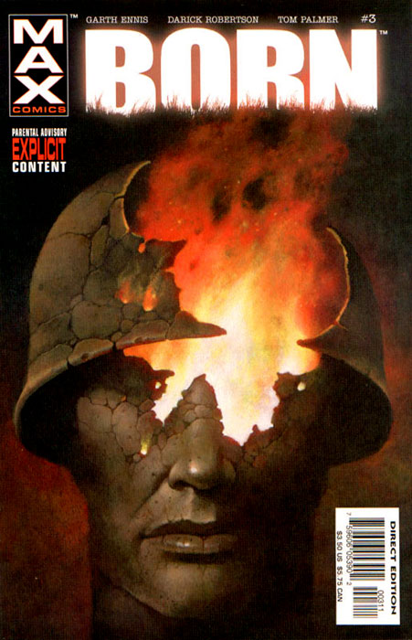 The beginning of issue three of Born shows various images from the Vietnam War: bombs falling from planes, a bridge filled with pedestrians blown sky high, American soldiers setting a Vietnamese village on fire, Vietnamese men and women dead in a ditch, and children burning at planes drop napalm. An unseen narrator comments on America being unable to give up just because America must show the world that they can’t be messed with. “Though we make the world despise us…Though we do things that will stain our souls forever…Though America eats its own intestines over this, cities riven with unrest, leaders inspiring loathing and distrust…We cannot lose.”