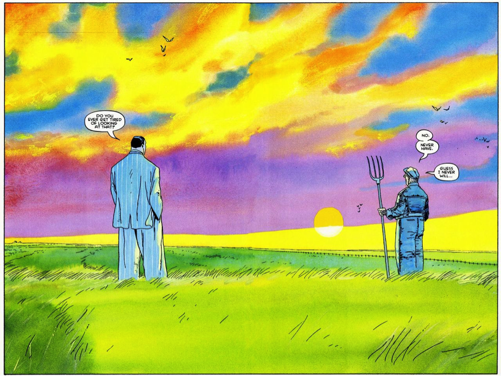 Clark Kent leads a comfortable life, for the most part. His family has a nice little farm, he has friends and a girlfriend, he knows the town people, and they are kind to him. Clark can spend his whole life in Smallville and lead a happy life. But that wouldn’t be best for the rest of the world. Clark can help people. He saves a man from a tornado and Pa Kent reflects back on it. “There are so few things a person can be really sure of. But, I believe, in the wild trouble of that moment…our son…became a man.” After, Clark looks out at the destruction and says, “I could have done more,” and Pa Kent thinks back that thinking he could have done more will continue to haunt him. They raised him right, and now they have to let him go out into the world. Superman: For All Seasons is more about a father having to let his child leave home than Superman battling some supervillain. It’s one of my favorite Superman stories. Pa Kent says it best on the final page of the first issue, “At the end of the day, I’m not sure we’re all that different from any other parents. We worry about our son. That he’s eating right. That he’s making friends. That he’ll stay out of harm’s way. Even if he is Superman.” By focusing on Pa Kent’s reflections and staying away from the obvious points of Superman’s youth (the discovery of his powers), Superman: For All Seasons allows an entry point for the reader. Haven’t we all felt we’ve had to move on, move away from our family and friends, from the place we are safe, so that we may have chance to reach our own potential?