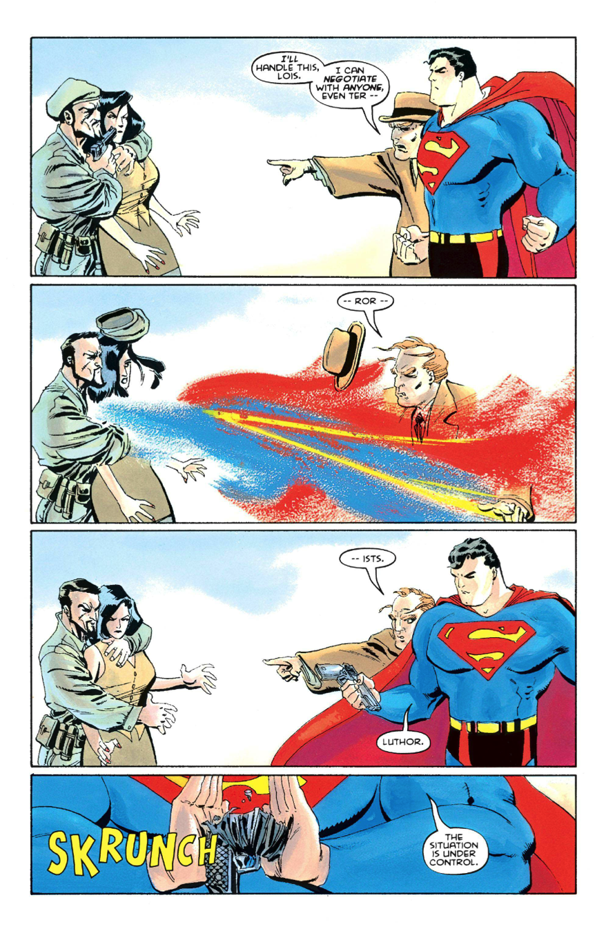 Halfway through the issue, a terrorist holds a gun to Lois in front of Lex Luthor and Superman. Lex, ever so full of himself, says, “I’ll handle this, Lois. I can negotiate with anyone, even terrorists.” Displaying the speed of Superman in still images is a tough act. Motion lines don’t really get the job done. Loeb and Sale show his speed by cutting Lex saying terrorists into three panels. He gets one syllable across in each panel. In the first, Superman stands beside Luthor. In the second, Superman is just a blue, red, and yellow blur. And in the third, Superman has the terrorists gun and stands beside Luthor once again. The other three characters haven’t realized what happened.
