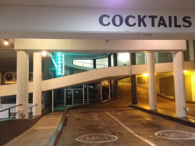 I’m at 5th and Colorado in downtown Austin to go to Garage, a cocktail bar hidden away on the first floor of a parking garage that you may not see if you’re not looking for it. On Colorado, don’t go up the ramp in the east side of the street between 5th and 6th, just look for the windows on the first floor and head towards them. A bouncer out front saw me taking pictures before I approached, and smiled as I went in. On the way out two hours later, around 11:00, there was a line to get in. Hadn’t seen that before. Normally I would never go to a place with a line to get in, especially for cocktails, even more especially downtown. Last time I was there was the Saturday night during SXSW, and the place wasn’t quite full and everyone I spoke to was from Austin. So perhaps the word is out now; I did see some tools in there, including two guys wearing a jacket and tie, and one guy in shorts and a white Polo shirt who ordered a Shiner Bock.