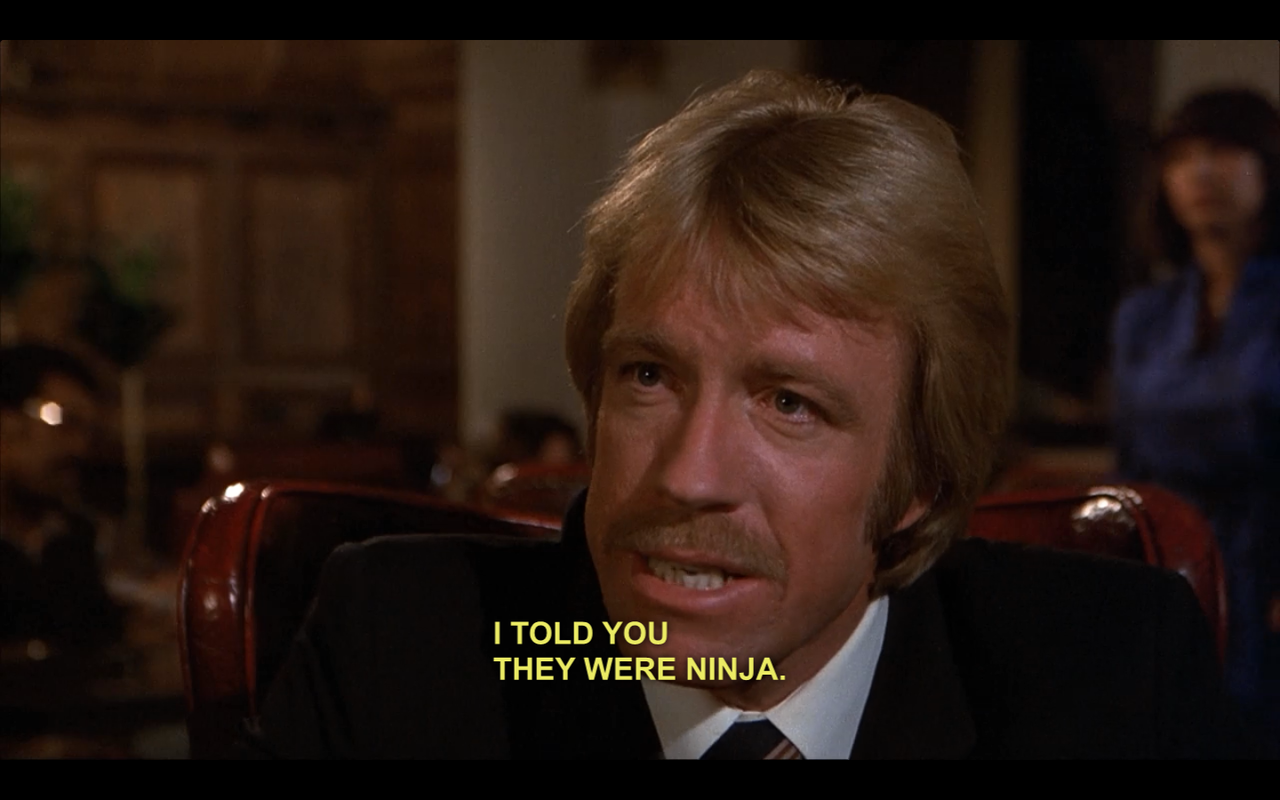 I guess his evil ninja brother grows up to run a ninja training camp. They’re a bunch of random mercenaries who show up to join the ninja clan. They’ve even got an Irish guy who gets in a tizzy when he finds out they don’t serve potatoes at the camp. Norris tries to investigate the mysterious ninja clan, but keeps running into people who are confused as to what he’s talking about. “Ninja? Is that some kind of new Japanese stereo?” And then Norris shows up at a square dance class. I don’t know why.