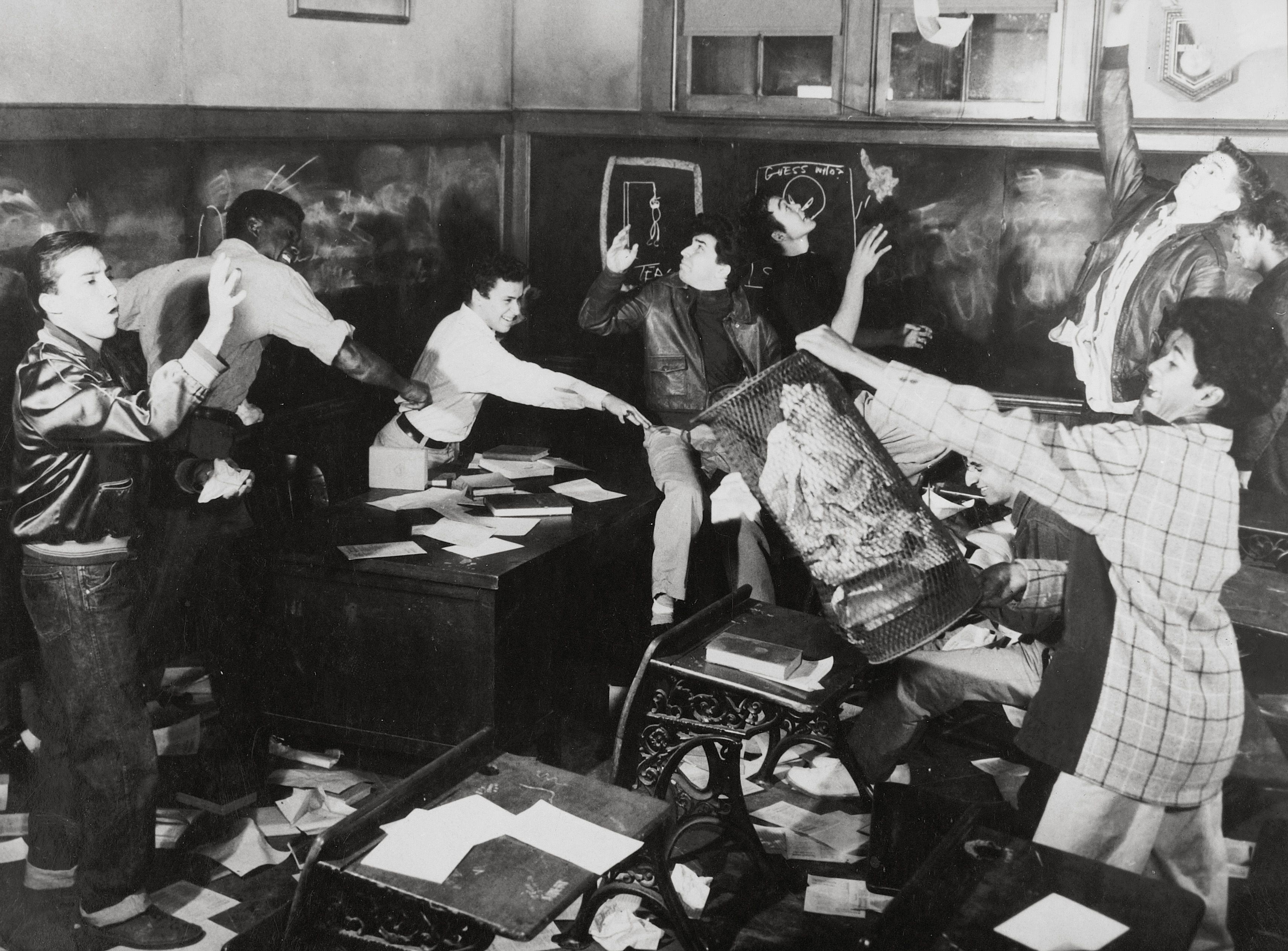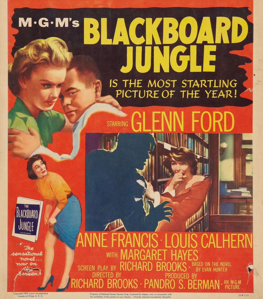 Hey, everybody! It’s Back to School Month here at the Museum of Schlock! And you know what that means? Juvenile delinquency. Let’s not mince words here. We’ll begin with 1955s Blackboard Jungle from director Richard Brooks. We’re already off to a bad start when we hear “Rock Around the Clock” blasting over the credits. The downfall of Western Civilization began with that song. How about instead of rocking around the clock tonight, you tell the adolescents to brush up on their civics tonight! Bill Haley and His Comets! Appropriate name for a band if those comets are meant to destroy America!