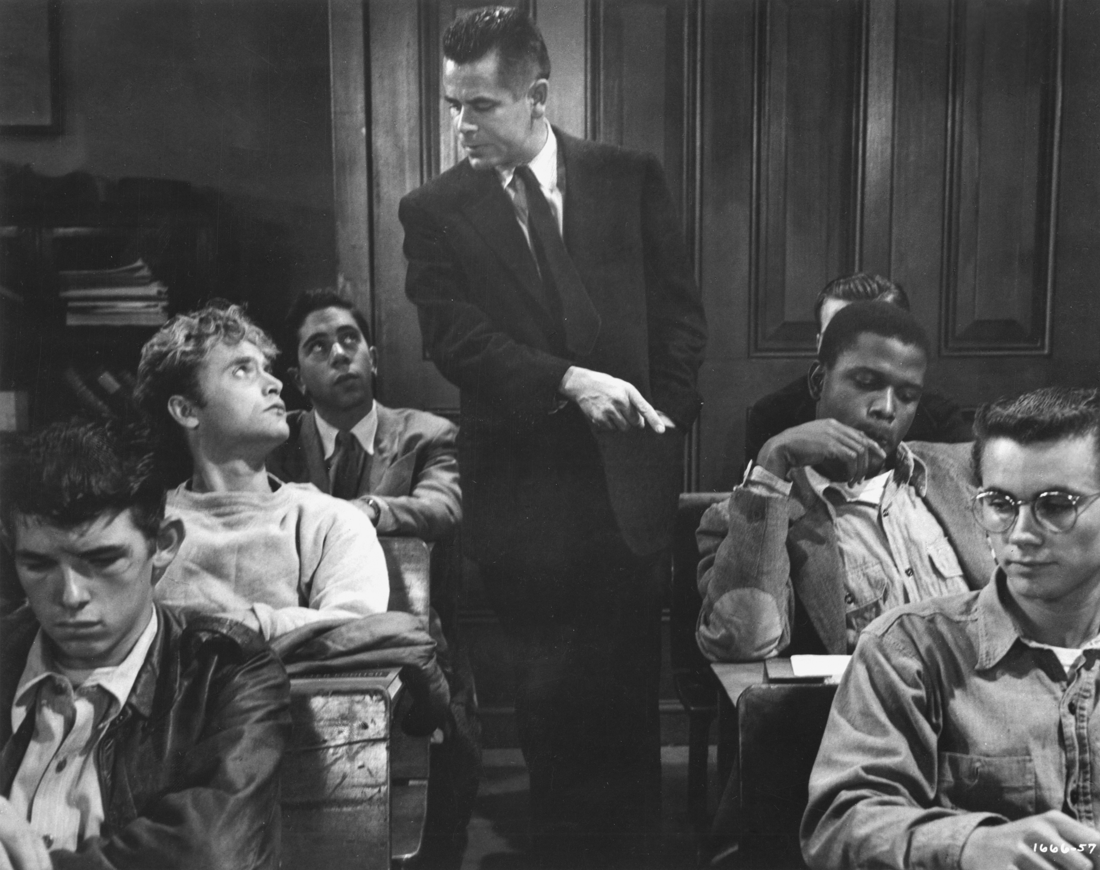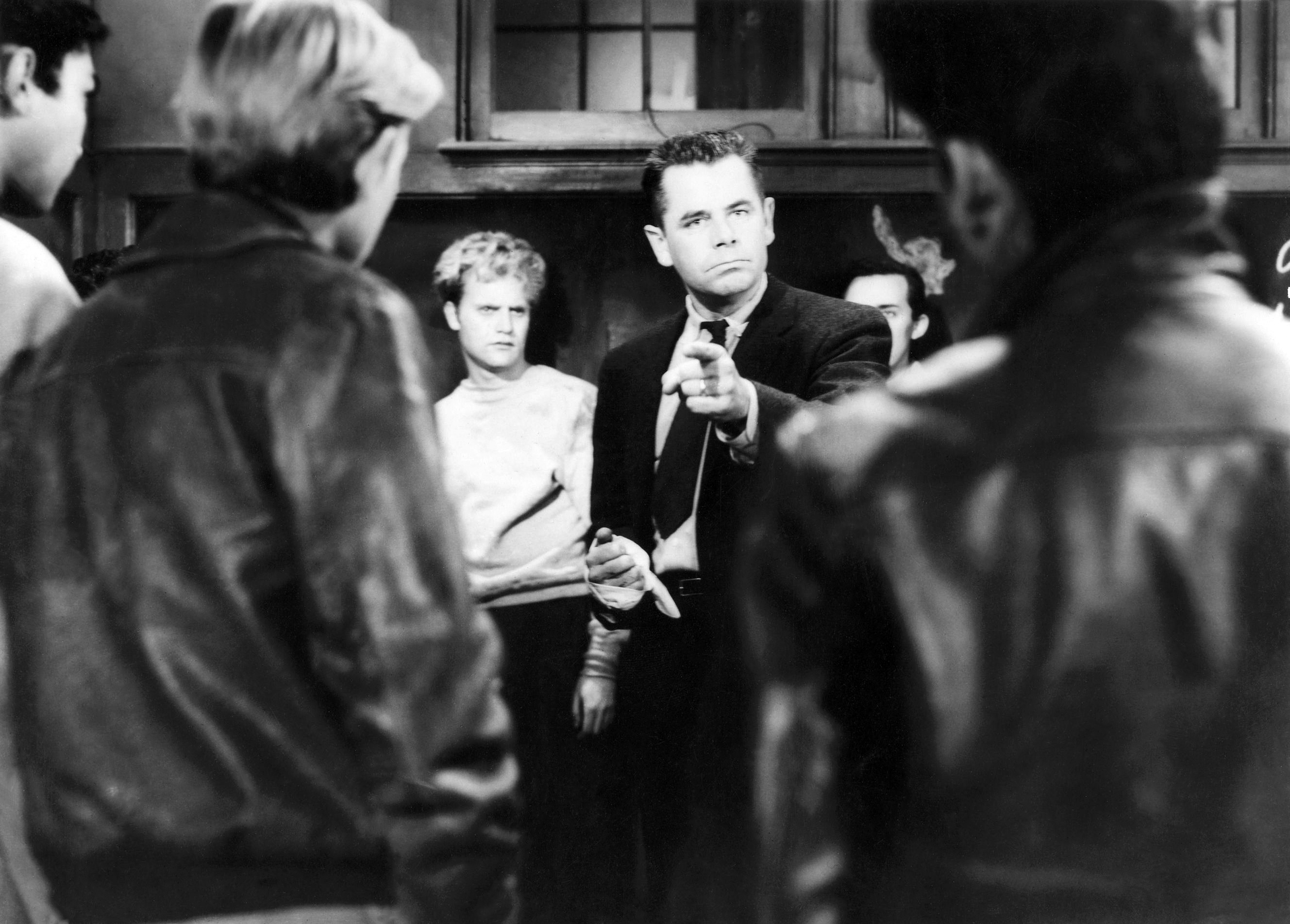 The movie starts out Richard Dadier (Glenn Ford) being interviewed for a teaching position. He wows the principal with his recitations of the Henry V, getting him the job on the spot. However, when he asks about the discipline problem at North Manual High School, the principal makes it clear that “There is no discipline problem in this school, Mr. Dadier. Not as long as I’m principal.” Okay. That’s a clear sign to the hell out of dodge, but our Mr. Dadier is a slow learner. He befriends another teacher whose name escapes me, but he wears glasses so we’ll call him Mr. Poindexter. He’s a fan a swing and brags about his rare record collection. Mr. Dadier takes his wife out for champagne and ravioli not knowing the horrors that await him Monday morning