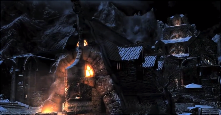 Though the Elder Scrolls games have an aesthetic of fantasy mixed with Medieval Europe, Skyrim took inspiration from farther north. The most obvious proof is in the region of the same name. Skyrim is mountainous and untamed with rolling plains and snow-covered tundra. The coast is sheeted in layers of ice incasing long forgotten dungeons while southward exists in perpetual autumn. The architecture is derived from traditional Norse structures with an artistic flair. In towns and cities stand long houses and stave churches with intricate designs and effigies carved into wood and stone. The many weapons and armor bear the Norse touch with great axes, swords with small hilts, and rounded shields adorned in complex knots and symbols. The accents of the characters and names are also Scandinavian in origin.