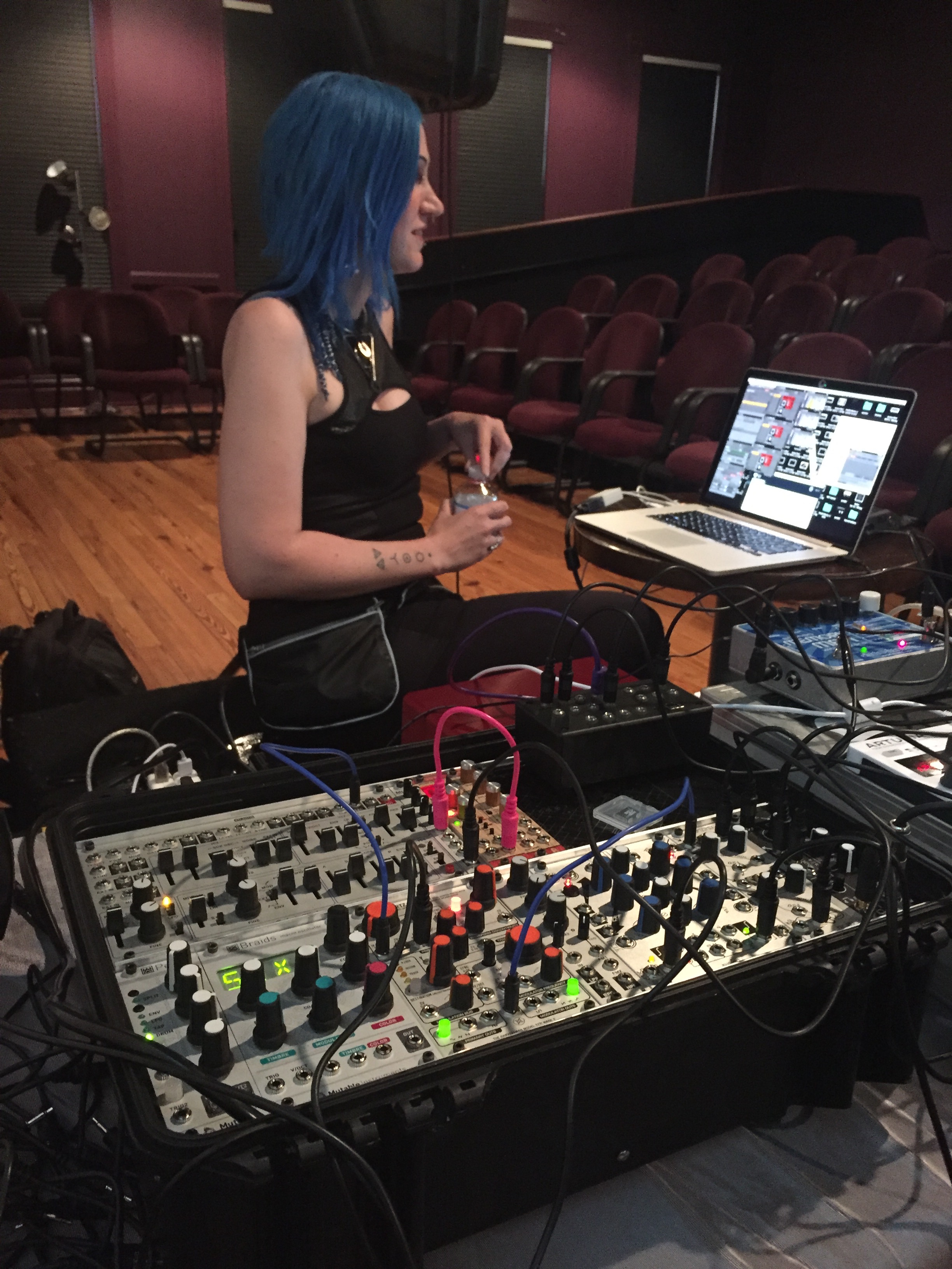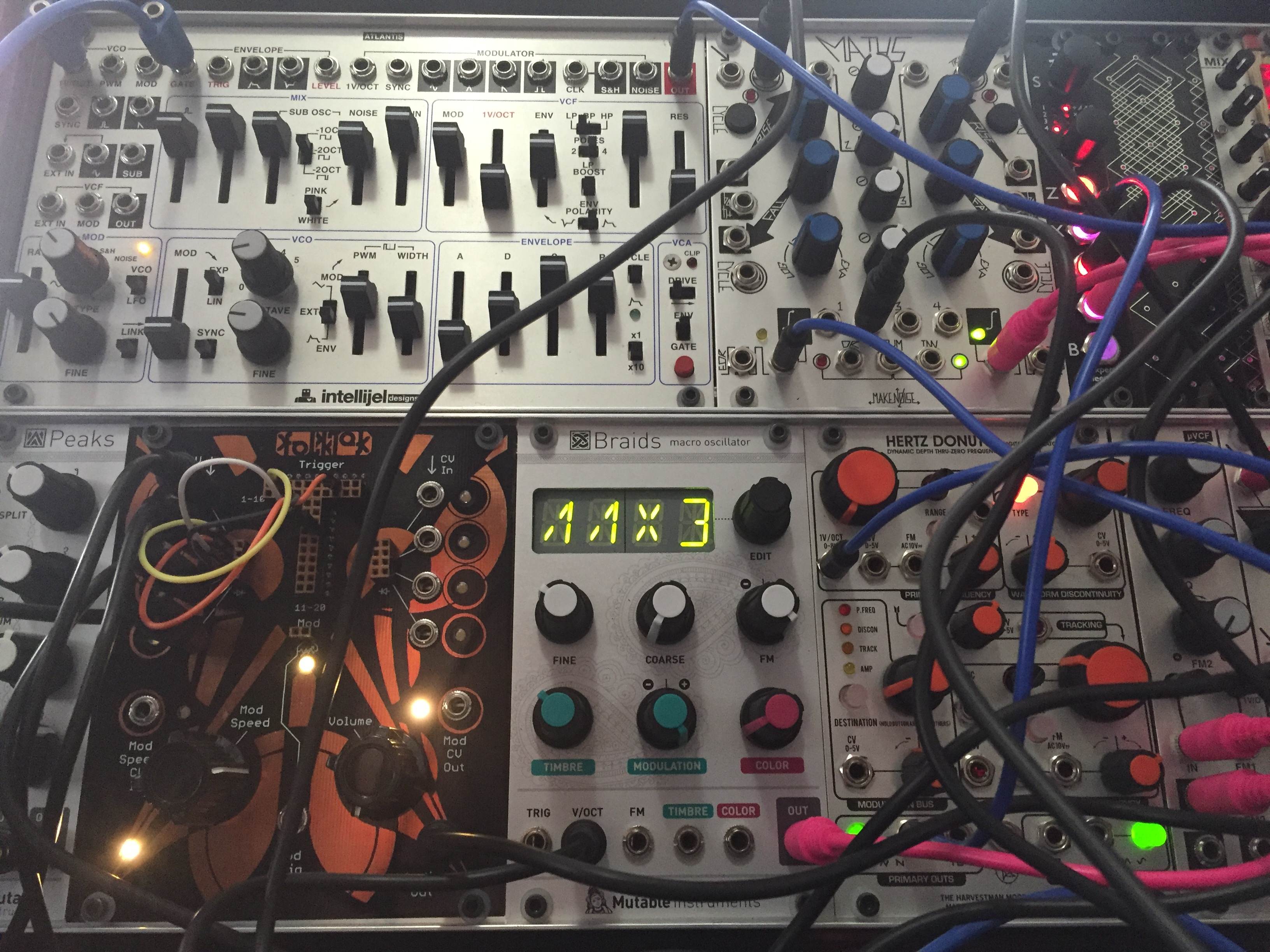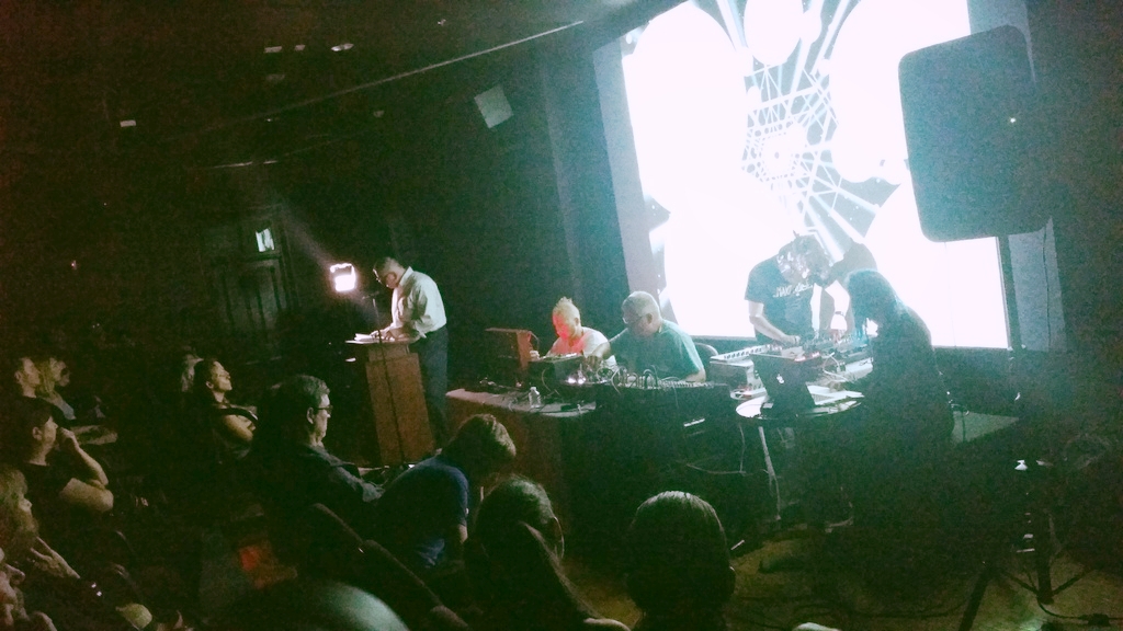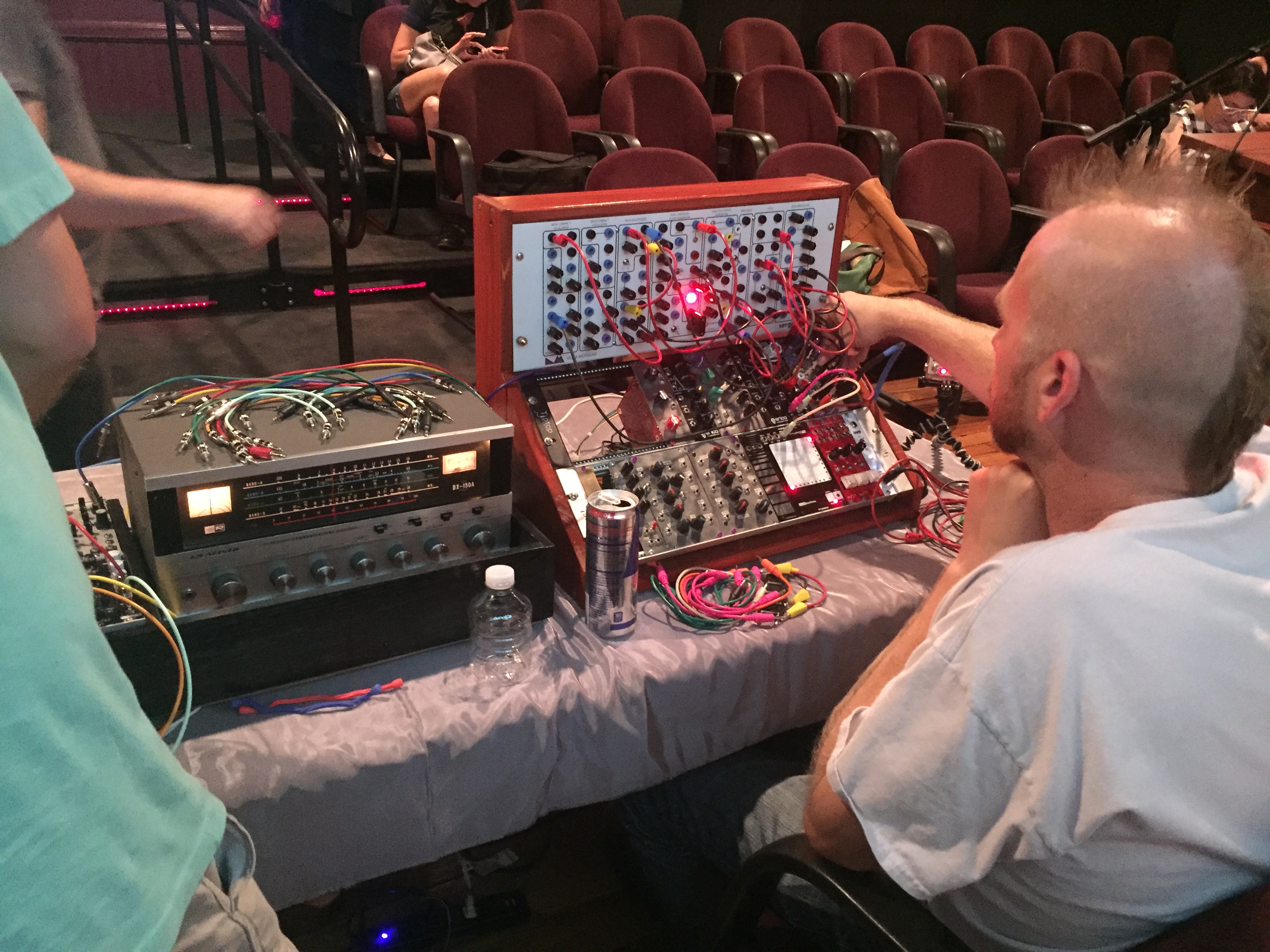 This part takes some explanation. I know many folks won’t be completely aware of what modular synthesizers are. Generally, they are like other synthesizers you may have seen or heard (zap, boom boom boom), but they present their components individually, and require that you determine how they are connected in order to create sounds. This requires a base-level of knowledge, but allows for an incredible amount of flexibility and variation from a simple collection of components. Sound sources (oscillators), modifiers (filters, etc.), and math/control functions (sequencers, envelopes), plus other cool modules (samplers, in this case) come together in many various ways to generate different sounds. We started with fresh patches each time. Each of our systems was chasing a common “clock,” which means that any elements we wanted synchronized together between our systems could be locked together with a common guiding timing signal that consists of electrical pulses. In the video of the event, you’ll notice us tweaking settings, pulling patch cables, modifying the sound. That’s how it goes every time.