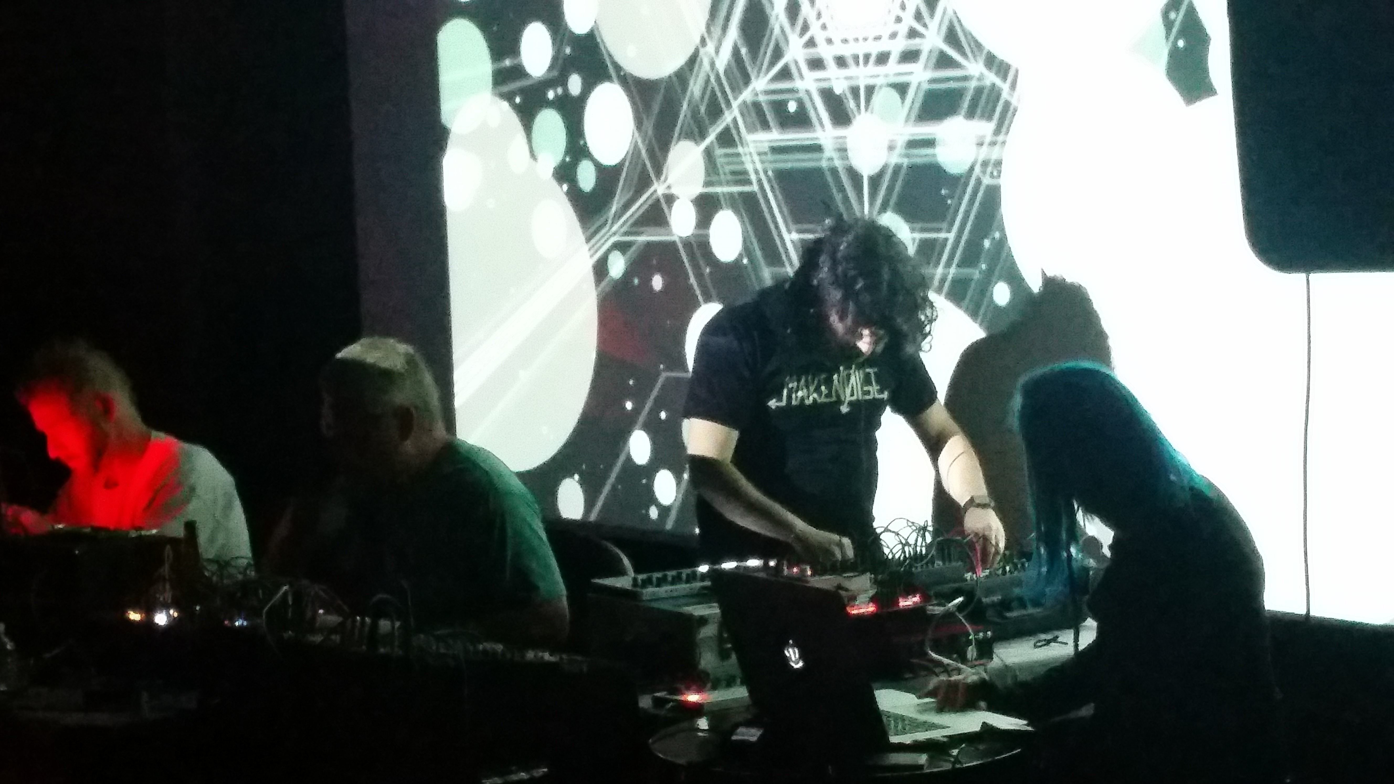 What she did, instead, though, was to create an entire program that received sound inputs from our modular synthesizers, and from the microphone at the event, and would vibrate and modify visual protocols she had designed. In essence, she wrote a sound-reactive program just for the event, and while she tweaked parameters live, the show was utterly one-time in that the sounds came from a set of variable un-repeatable instrument settings running chaotic patterns, modifying visuals that were designed to react to these patterns.