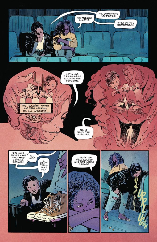 How do people live in Shudder-to-Think? Like Eldora and Octavia, the people are trapped. An old mining town doesn’t have much to offer outside of the mine, and when the town is owned by the Company, the outside world may as well not exist. This is Eldora and Octavia’s world and this is a world suspended in an interesting state: continually unchanged, but some things change under the surface. Even the monster that we see in this first issue—a human-like deer of flesh—is met with horror as well as a desire to keep it secret to waylay any curfew that might come from its discovery. The characters themselves mention how the world feels as though it has shifted after they woke up in the movie theater, and that’s what Shudder-to-Think feels like: the world as we know it, but shifted.