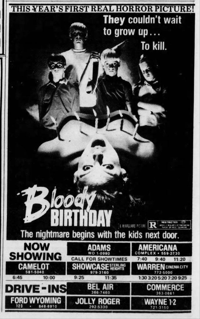 But what I don’t like is children. Yeah, I didn’t like children when I was a child and I certainly don’t like them now that I’m a man of distinction. Children are the main focus of tonight’s feature film, 1981’s Bloody Birthday from director Ed Hunt. The movie begins with three children being delivered at a hospital during a solar eclipse, two boys and a girl. And I guess if your born right at the point of an eclipse, you’re a bad seed.