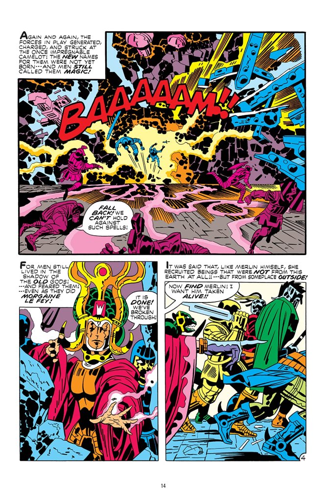 Who is this Demon? Etrigan was spawned from the words of Merlin as Camelot fell to the sorceress Morgaine le Fey. This Demon would be the protector of Merlin and Camelot as Merlin’s magic entombed himself and his Eternity Book away from le Fey so that her magic would fade with time. But, of course, that doesn’t happen. We’ve passed the time of ancient kingdoms and into the 70s where demonologist, Jason Blood, is researching the origins of a mysterious piece of parchment that has been in his family for hundreds of years and how it affects his fate. And so the words on the parchment help to bring forth The Demon, Etrigan and Morgaine le Fey is still around searching for Merlin’s Eternity Book. All of this, as is typical of Kirby’s work, is only in the first half of the first issue of The Demon series.