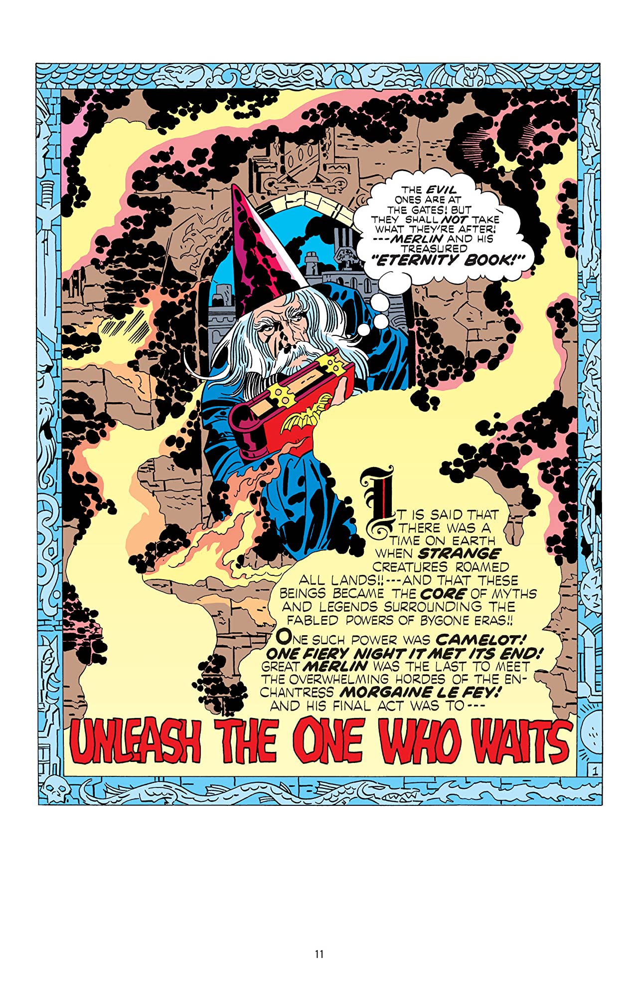 Who is this Demon? Etrigan was spawned from the words of Merlin as Camelot fell to the sorceress Morgaine le Fey. This Demon would be the protector of Merlin and Camelot as Merlin’s magic entombed himself and his Eternity Book away from le Fey so that her magic would fade with time. But, of course, that doesn’t happen. We’ve passed the time of ancient kingdoms and into the 70s where demonologist, Jason Blood, is researching the origins of a mysterious piece of parchment that has been in his family for hundreds of years and how it affects his fate. And so the words on the parchment help to bring forth The Demon, Etrigan and Morgaine le Fey is still around searching for Merlin’s Eternity Book. All of this, as is typical of Kirby’s work, is only in the first half of the first issue of The Demon series.