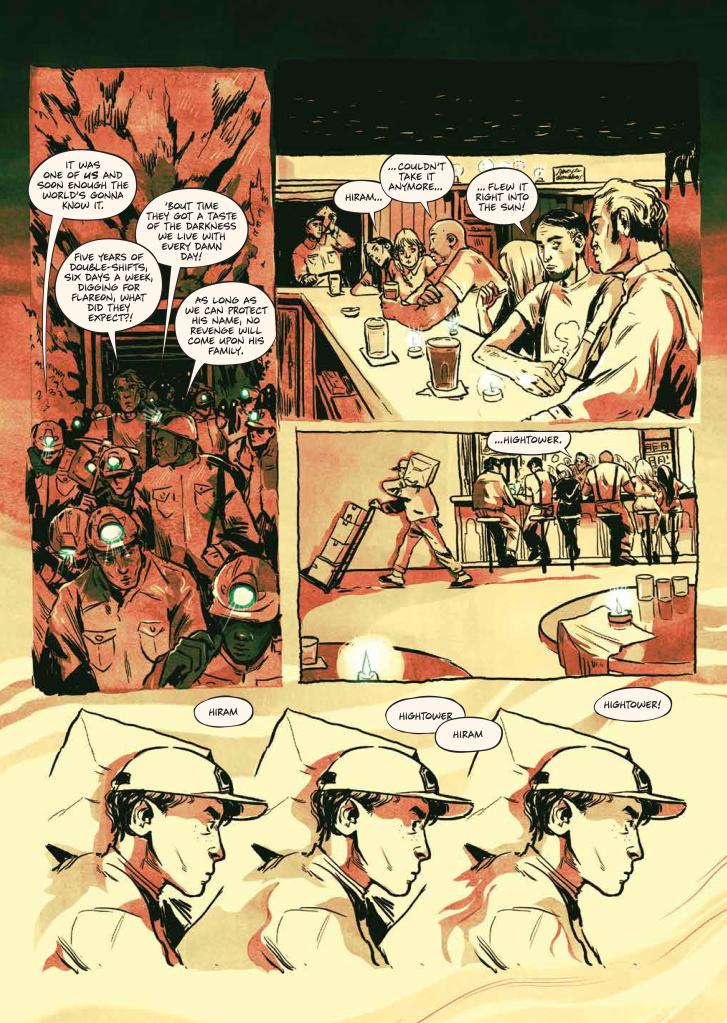 This expansion of Gay’s original story is something that could really only be done within the medium of comics. Through Kirby’s art can we see the extent of Hiram Hightower’s legacy of sunlessness. And it is through her art as well that we see the five years Hiram had spent underground without seeing his family or the sun. Her lines resonate perfectly with Gay and Oliver’s words throughout. From the closeness of the Hightower family to the sparseness of a nearly sunless sky to streets crowed with artificial light, the original story can breathe so much more into its distances and silences.