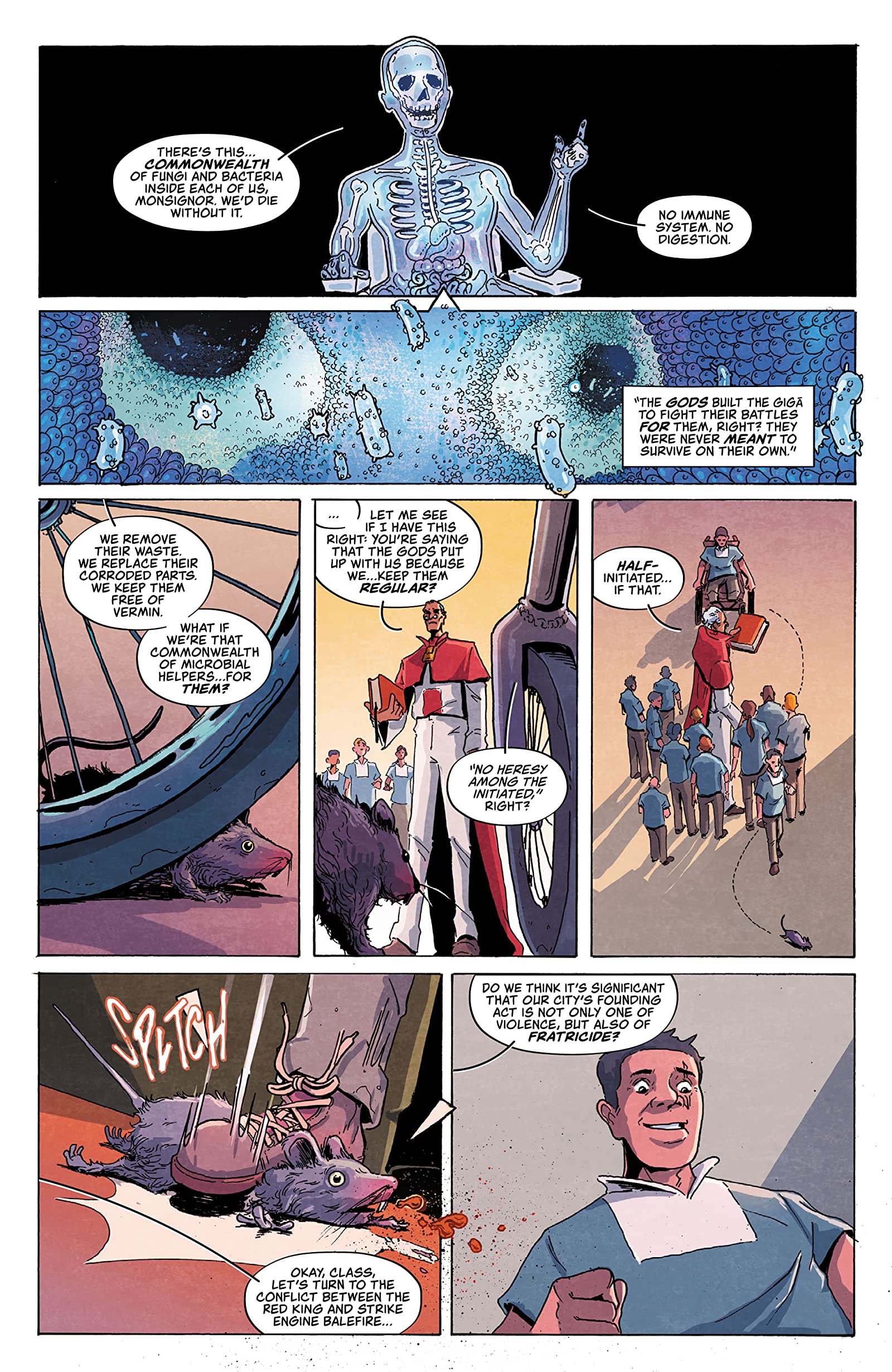 Vault Comics excels at first issues. Giga continues that trend. A first issue is one of the hardest things to write in comics—the balance of world-building, introducing characters and tone, and establishing a story in roughly twenty something pages is a feat. Paknadel and Lê manage this balancing act due in part to their method of storytelling in this issue. We learn a small amount of Evan’s past and his connection to the religion around the Giga, but an explosion occurs and we hard cut to thirteen years later where he’s struggling to survive. We’re given our world in just a couple pages—from the attitude of the world to the Giga to the general struggle of living in a world that exists in the shadow of giant robots.