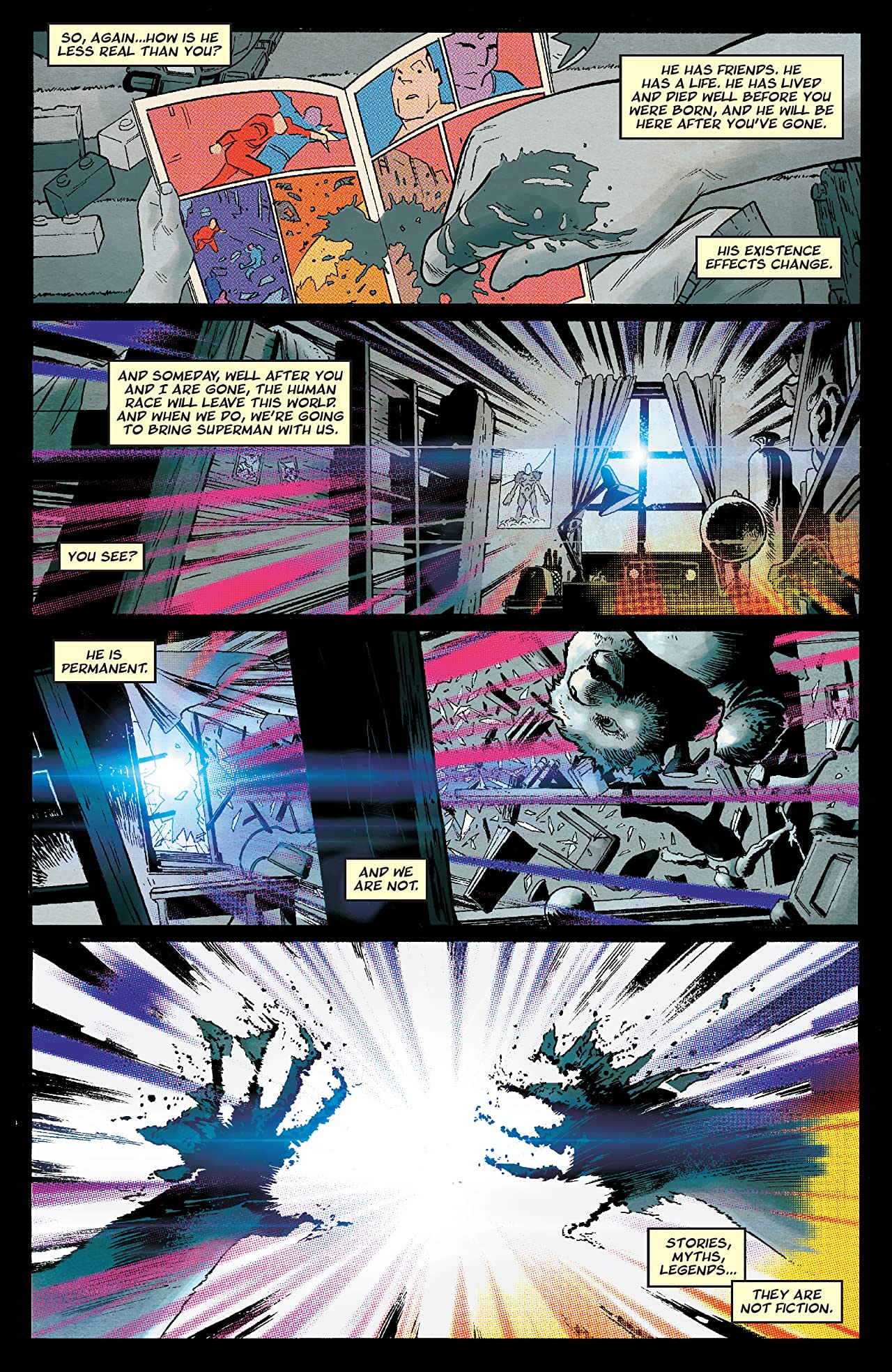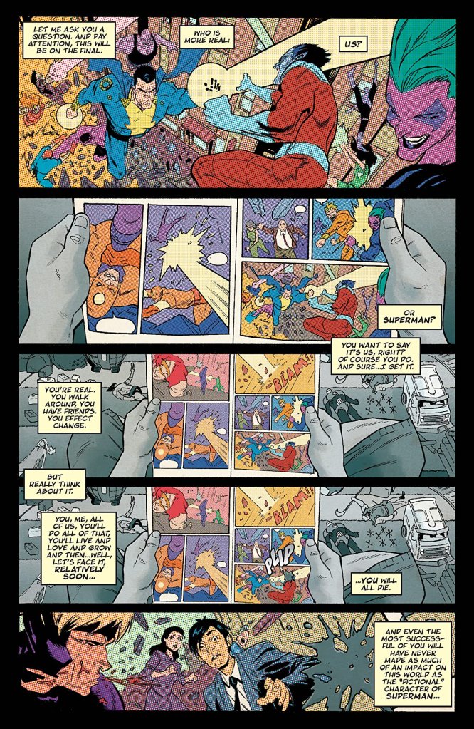 What is really interesting in this first issue is how far Cates, Shaw, Cunniffe, and Hill go when asking about the reality of comics. This first issue outright asks if we the readers or Superman is more real in our reality. It’s a Morrison-esque analysis on our perceptions of reality intertwined with comics. And with a first issue, the creative team is here looking to see where they can bend that reality as this is our world, more or less. People carry around issues of Hulk, Rawhide Kid, and Supermanin Provo, Utah and feel incredibly ordinary. But then there’s a looming threat somewhere out of sight that has the entire world on edge. Wait, no, that’s ordinary too. What isn’t ordinary is the idea of crossing over, of the comic characters coming through the veil of reality into our own world. As this is the first issue, that hasn’t been explained just yet, but it also doesn’t feel like it needs explaining as much as it needs examining.