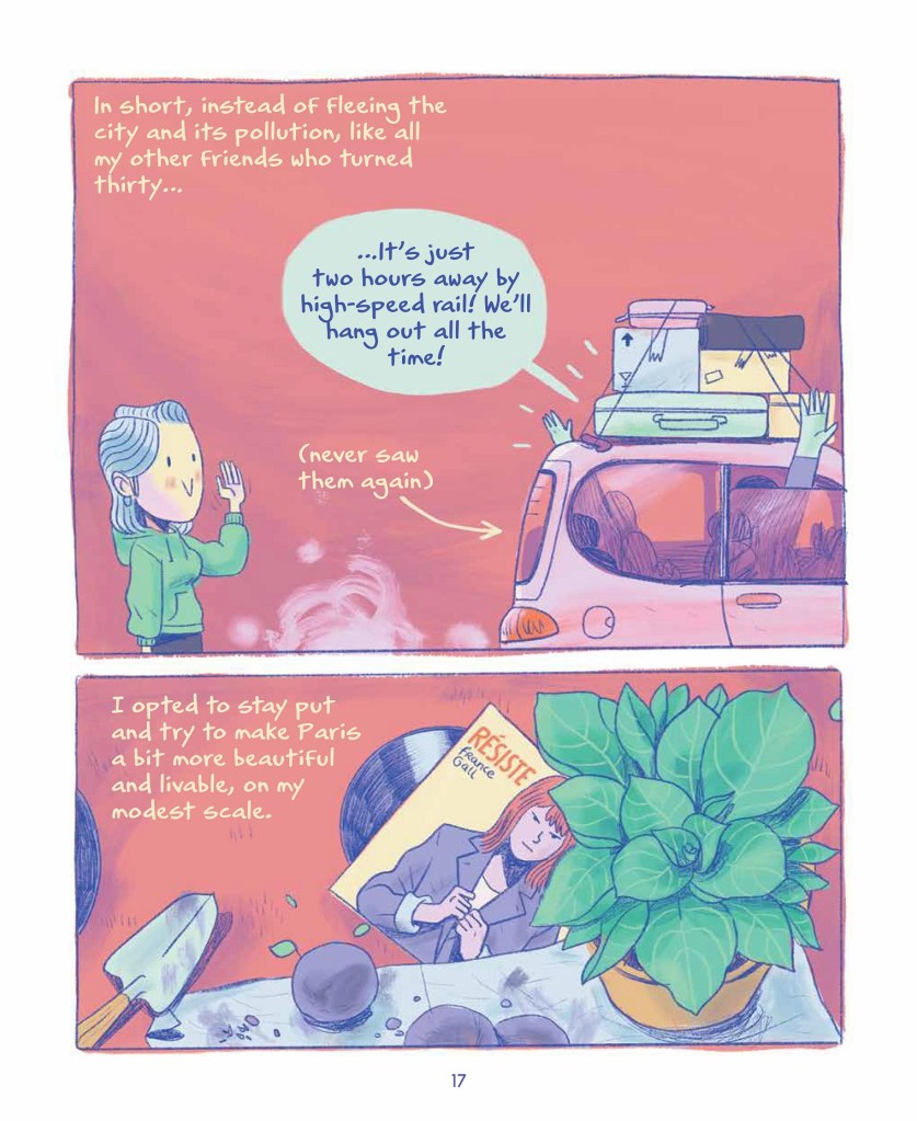 More than anything, Guerilla Green is a story about Damblé’s own journey from simply being a resident of Paris to being actively engaged in making her city a greener, more livable space. Beginning with her own personal efforts with guerilla gardening, she goes onto the history that had inspired her to begin her gardening—from The Digger group in England in the 1650s to Liz Christy in 70s Manhattan to the modern efforts of Ron Finley in LA. She highlights how this isn’t just a singular effort, but rather a community coming together to try to make something from the disused parts of the cities they live in. And outside of a call to gardening arms, Damblé speaks on how the awareness of green spaces in Paris has transformed how she views the city itself as well as greenery in general.