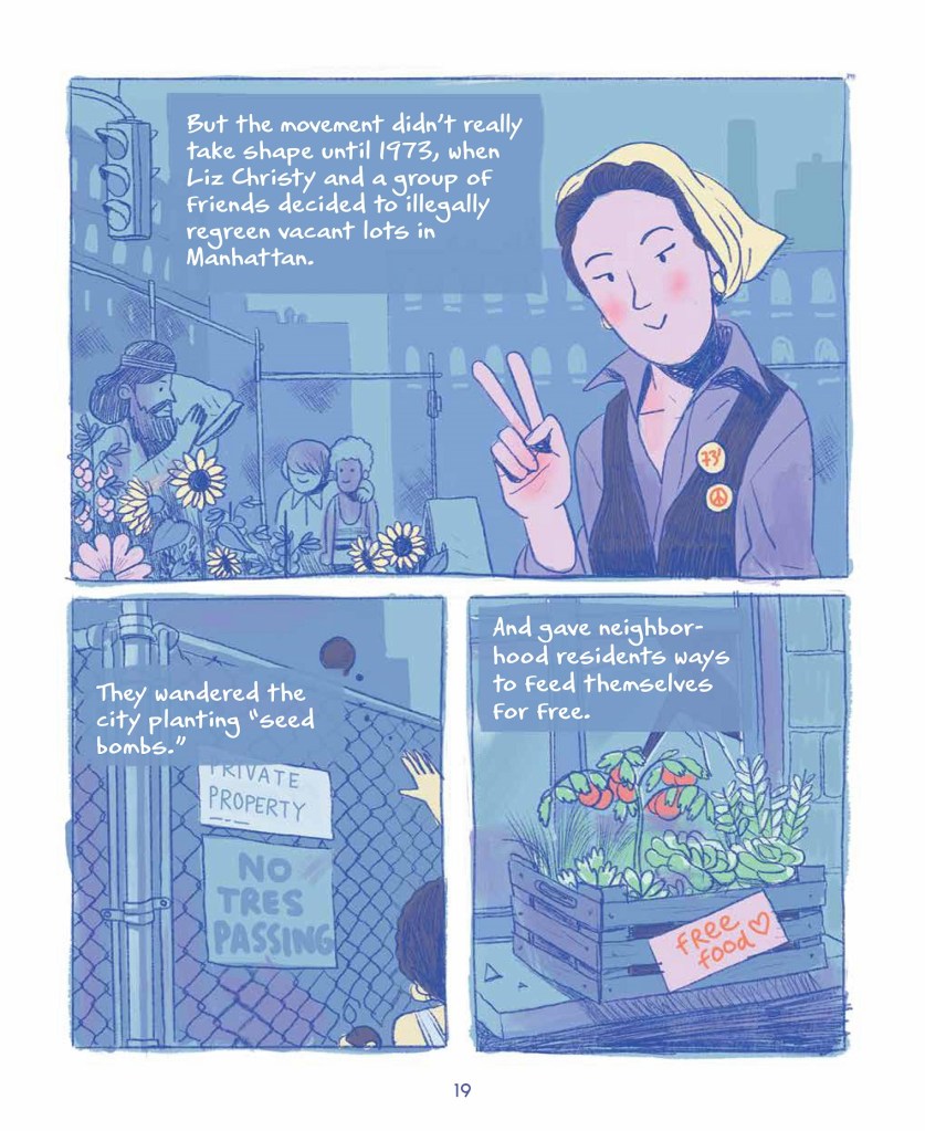 Part history, part guide, part personal narrative, Damblé and Kalkair have crafted a graphic novel that feels like a graphic textbook for a class on guerrilla gardening. From the beginning, we’re presented with the idea of guerilla gardening in urban spaces—more or less, the reclaiming of disused green spaces in cities to beautify and to provide food for residents. Through Damblé and Kalkair’s view of Paris, we can see the abandoned lots and patches of grass along sidewalks and roads that are ripe for the planting of most anything. And it isn’t simply planting for the sake of planting, the guerilla gardening movement the book espouses looks to help heal urban soil and ensure that the people living in food deserts have access to fresh food across their cities free of charge.