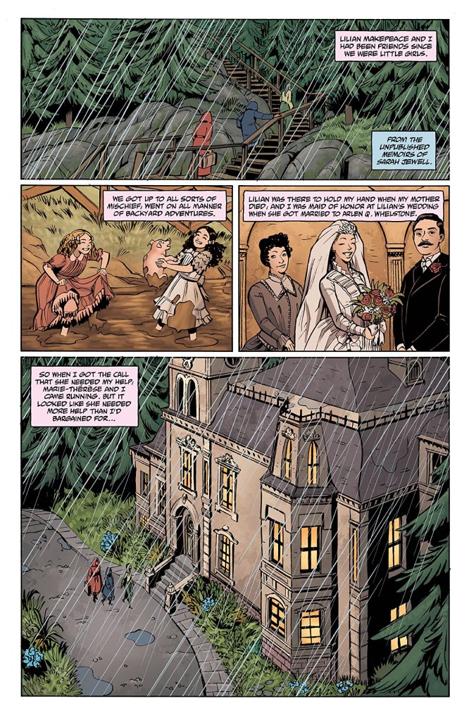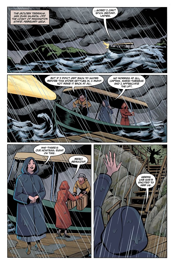 As this is the first issue of a mystery series that follows along in the Agatha Christie tradition, a few things must happen. The setting must be established as both precarious and isolated. We start at a mansion on a deserted island in the middle of a storm that has cut off all communication. Next, we have to be introduced to the detective whose reputation precedes them: enter Sarah Jewell and her companion, Marie-Therese, on the last boat to come to the island. Next, the murder. It happened before the sleuths arrive, but just long enough before for some of the tension to diffuse in the mansion. And then, of course, the murder itself. A lawyer at the mansion, Severin, in to appraise and auction the various ancient and occult items being held in the mansion. Then the cast of characters—the lot of odds and ends that are equally innocent and guilty. At least, until another body shows up.