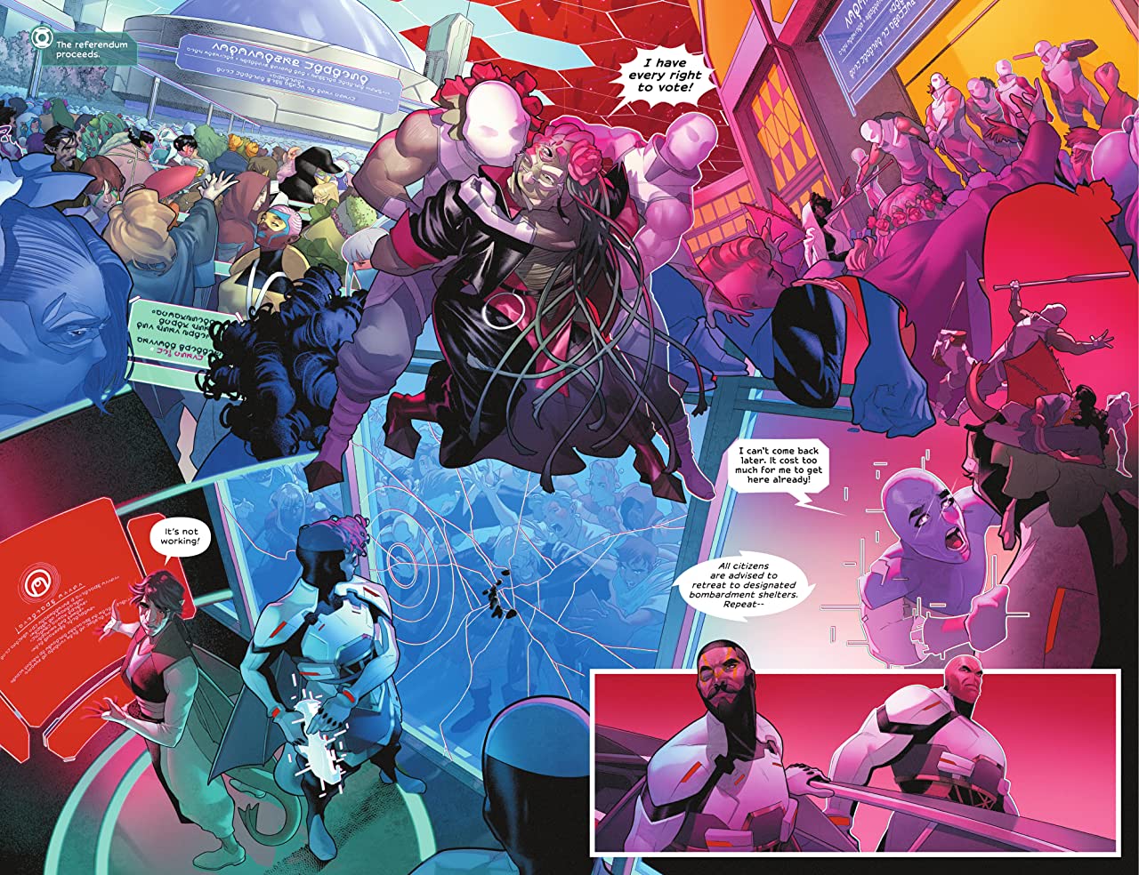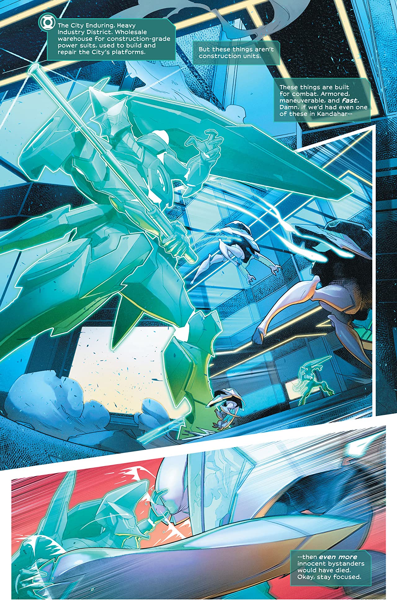 When we last checked in with Sojourner “Jo” Mullein, the City Enduring was in a state after protests linked to both the emotional uninhibiting drug, Switchoff, and the first two murders in the city in about five hundred years. Since then, though? We’ve been through meme black markets and sweatshops, further murders, an attempted coup, and a fight in AI-space that could have killed Jo. You know, standard Green Lantern fare. But from Jo doing her best Kamina to the complete upheaval of society, Far Sector does not know how to stop. Jemisin and Campbell are masters are creating the kind of story and pacing that takes full advantage of comics as a storytelling medium. We can get whole issues of almost non-stop action with others that slow the pace and give us time to process and reflect alongside Jo herself. We fight as she fights, discover as she does, and rest in turn.