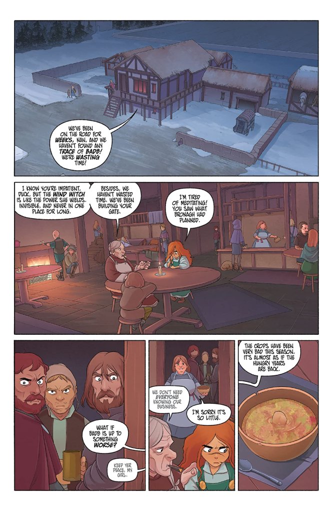 Since we had last talked about The Last Witch, Saoirse has discovered her latent witch abilities, is now on a quest with her brother, Brahm, and their Nan to defeat four powerful witch sisters and their leader to prevent them from opening a door to the fae realm and unleashing the world-eating Fairy King. More or less, from playing in the woods to preventing the end of days—the story has escalated its stakes quite a bit. And even by the end of this volume, three of the four witch sisters has been met and dealt with by Saoirse and her ever-increasing magical skill with the ley-lines pointing her where to go for the final sister. But there is also doubt. McCreery, Glass, Nesterenko, and Campbell have set up a background menace to the whole thing—even at the end of this story, we don’t quite know who we’re supposed to be rooting for.