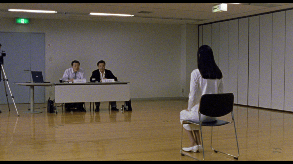 Aoyama gets the privilege of screening the submissions to get the contestants down to an even thirty. One of these contestants catches his eye, a young woman named Asami (Eihi Shiina) who gave up a career in ballet due to hip injury. Later, Yoshikawa and Aoyama interview the contestants, Yoshikawa asking all kinds of probing questions while Aoyama impatiently waits for Asami’s turn. When Asami does show up, Aoyama is instantly smitten by the shy, young woman. He conflates how she felt about losing her ballet career with how he felt about losing his wife.