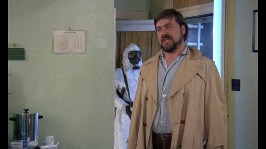 Two firefighters, Dave (Will McMillan) and Clank (Harold Wayne Jones), arrive at the scene of the fire and can’t believe Mitchell would murder his wife and set his house ablaze. Dave’s pregnant fiancé is a nurse named Judy (Lane Carroll) and she’s helping Dr. Brookmyre treat the burn victims. Soon, the army shows up and commandeer Dr. Brookmyre’s office. Under the orders of a Major Ryder, the entire town of Evans City is now under quarantine. No one can leave or enter without official authorization. Hazmat suits and gas masks are now the standard for all government officials occupying the town.