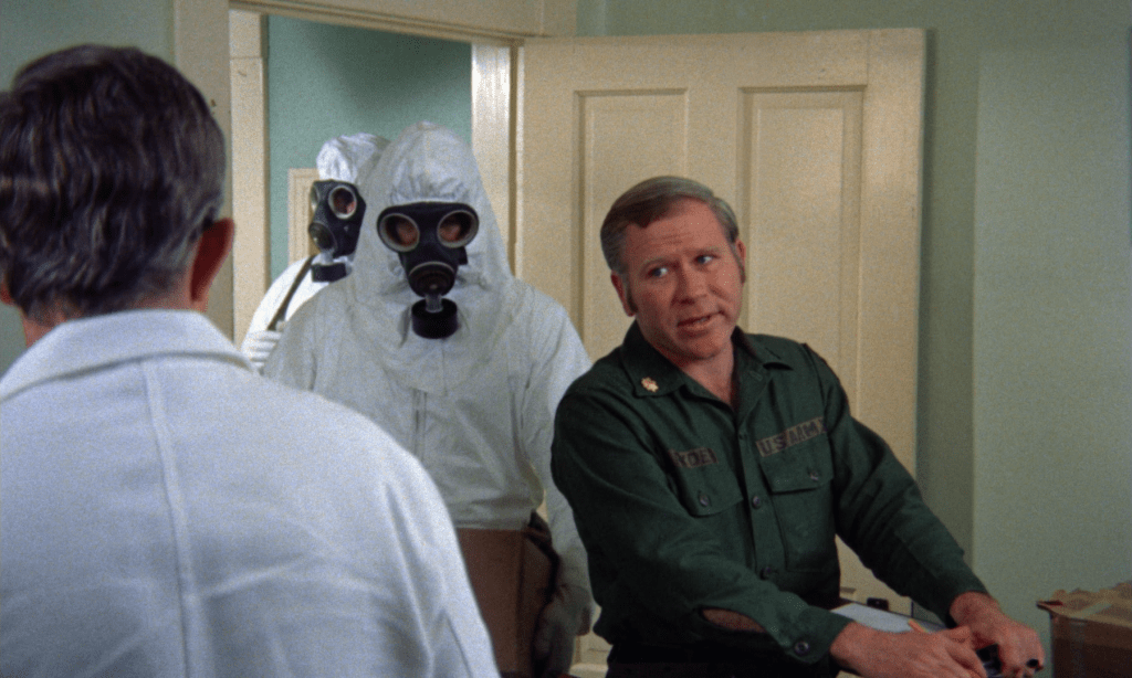 More government officials arrive in the form of Colonel Peckmen (Lloyd Hollar) and Dr. Watts (Richard France). Both of them had worked on the Trixie project and are felt to be the best ones to deal with that mess. Colonel Peckmen demands that every citizen in Evans City be rounded up and put in the high school as Dr. Watts works on a cure. Dr. Watts complains about not having the right equipment, the bureaucratic red tape, and having to wear the gas mask.