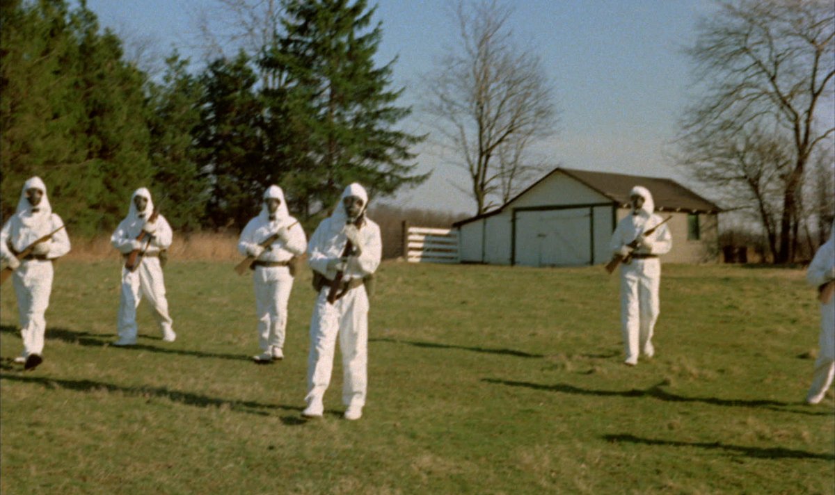 It seems that a plane carrying a bio-weapon (codenamed Trixie, naturally) crashed in Evans City and infected the water supply with a deadly virus. Infected citizens either die or go stark raving mad. There’s a wonderful scene of a kindly old grandmother knitting a sweater while rocking in her rocking chair. When a couple of the hazmat soldiers show up to her place, she gleefully stabs one of them to death and goes right on knitting as if nothing has happened.