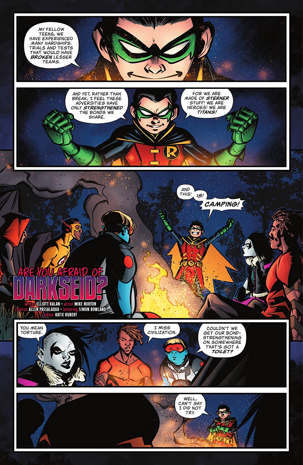 Centered around the Teen Titans telling campfire stories, Are You Afraid of Darkseid? is a collection of short pieces from the creepiest parts of the DC Universe. Encompassing everything from urban legends and folklore to cryptids and monsters to some more creeping horrors in the form of stairs and buildings, the Titans try to scare each other as much as they can to become closer as a team. And, honestly, the creepiness of these stories works incredibly well throughout. There is a piece on The Phantom Stranger and their role in the universe that feels like it was taken from some of the original 60s anthologies; another on Batman and the Mad Hatter that’s reminiscent of the “killer in the backseat” urban legend; and a story with Aquaman and Aqualad defending Ogopogo from the other creatures in Okanagen Lake.