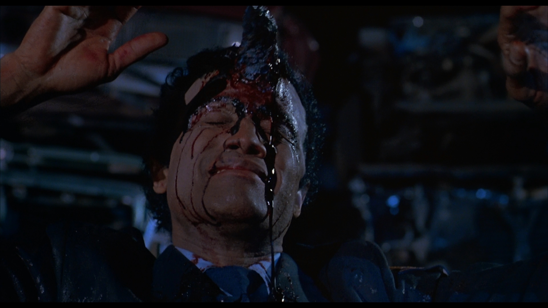 Seriously, Brian goes to a junkyard and starts seeing funky colors dancing off of all the stacked automobiles. He’s so entertained that he doesn’t really notice Alymer sucking the brains out of the nighttime security guard. Brian’s brother, Mike, and girlfriend, Barbara, notice that Brian is acting strange. When Brian takes Barbara out for a fancy dinner, he sees spaghetti and brainballs on his plate.