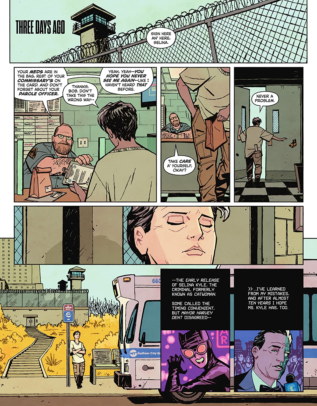 Selina Kyle, Catwoman, has been in Blackgate Penitentiary for the past ten years for the alleged murder of Bruce Wayne. In that time, Gotham changes. A storm passed over the city, resulting in destruction and flooding, including Kyle’s old home. Harvey Dent has passed himself off as newly-reformed and is currently mayor of Gotham—a position he’s used to commute Kyle’s sentence early. All of this is the direct result of an event, Fool’s Night, that happened a decade before the story began, that resulted in the death of much of the Bat-family, Commissioner Gordon, and potentially hundreds more that we don’t know about yet. Gotham has reacted to this night violently, trying to exorcise the darker parts of itself—Catwoman and every other nemesis of Batman included.