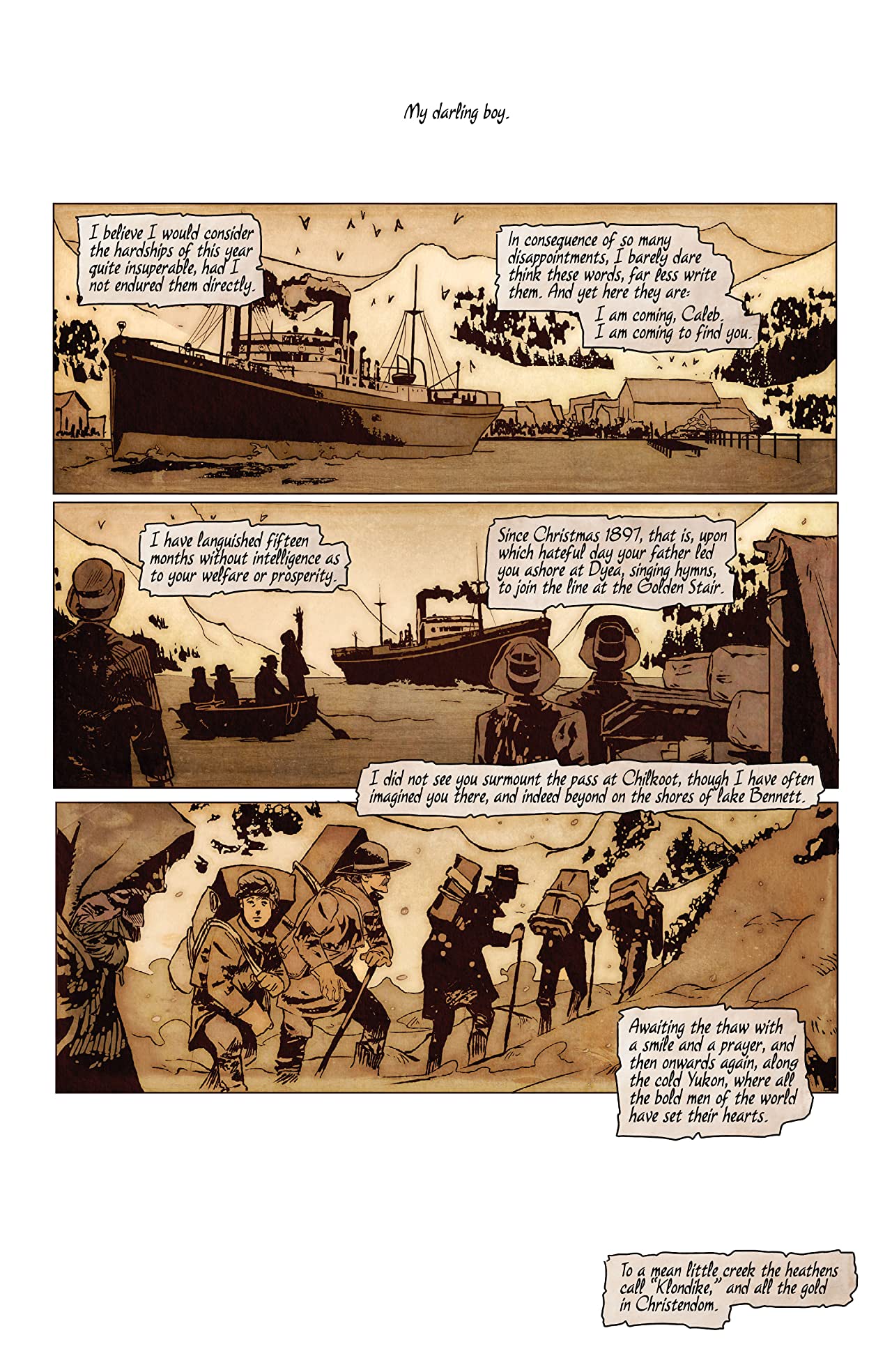 Unnamed horrors bookend this first issue of The Rush. We are met with the bowler-hatted figure on this issue’s cover along with brief glimpses of giant spider legs. We know more about Nettie Bridger. A mother in search of her son, Nettie traverses the rivers and snow in the north to reach the Yukon valley and the gold seekers that may have some information about her son’s whereabouts. While the few opening pages gives us some essential context in the form of a letter she is writing to her son, we see the inklings of a larger problem rearing its head. While we see the letter and the moments she describes writing, the letter is never written. The land itself seeks to delay her finding her son.