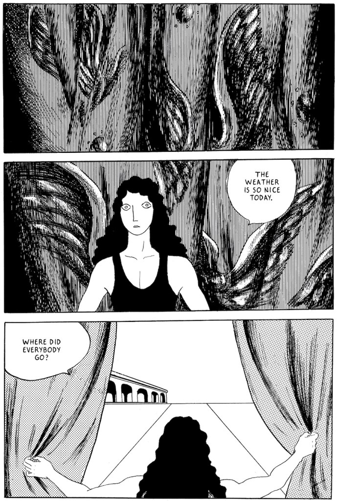 A collection of short stories collected from Tsurita’s career, The Sky is Blue with a Single Cloud shows not only an array of Tsurita’s skills as an illustrator, it also showcases her development as a manga creator over the course of fifteen years. From her earliest stories, like “Nonsense” and “Woman,” both published in legendary alternative manga magazine Garo when she was eighteen, we first see her fascination with life, death, and the idea of succumbing to a cyclical fate. But it is the story “Anti” that Tsurita’s look at death begins to crystallize. In this story, we follow a filmmaker shooting footage of an active volcano before spotting a man struggling to climb out of the vent. The filmmaker does nothing as the man falls and uses the footage he’s shot as the climax of his own experimental film. The laughter following his showing the film to friends after they ask if the man falling was an effect is as haunting as any horror comic since.