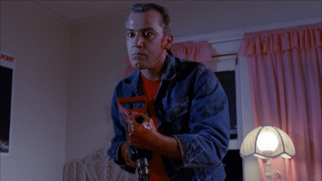 Slumber Party Massacre begins with a late breaking report about an escaped maniac named Russ Thorn (Michael Villella) who uses a power drill to slay his victims. One wonders how these mass murderers always manage to escape and how quiet suburban communities never seem to take these maniac situations very seriously. For instance, Russ manages to stop by the local high school and murder a teacher and a student with no one ever noticing he’s there.
