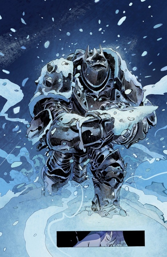 But the thing that stands out most in this story is the effective use of mise en scéne by Bergara throughout. These establishing shots and expansive vistas envisioned every few pages gives us both a sense of scale and mood. We have these moments of the girl playing in the foreground while the armor fights off something horrifying in the background that demonstrate their place in this world. But it is in these vast, quiet pages that we really see the scale of them both. The girl is tiny enough to fit in the hands of the armor, but they’re both still dwarfed by the sheet scale of the world they’re traveling through. We never really know where they’re traveling to, but we know immediately how long it will be until they get there: a long goddamn time. But then we’re happy for that, as it means we get to experience more of Bergara’s art.