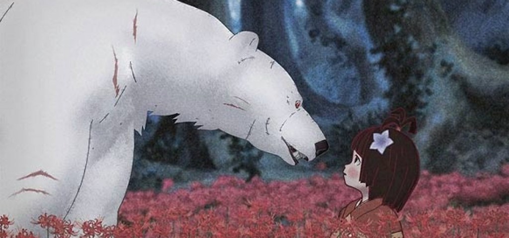 The third short is Gambo, a tale of a bear and an ogre. The short begins with a defeated samurai asking the big, white bear Gambo if he’s a messenger from God or something to that effect. In a nearby village, a giant red ogre with a twisted face and sharp horns attacks the villagers and makes off with one of the young maidens to impregnate her with his devil spawn. Later, Gambo meets the daughter of the emperor who conveys her despair and gets him to destroy the ogre’s lair. A brutal fight between bear and ogre ensues. The samurai from the beginning of the film rushed to Gambo’s aid.