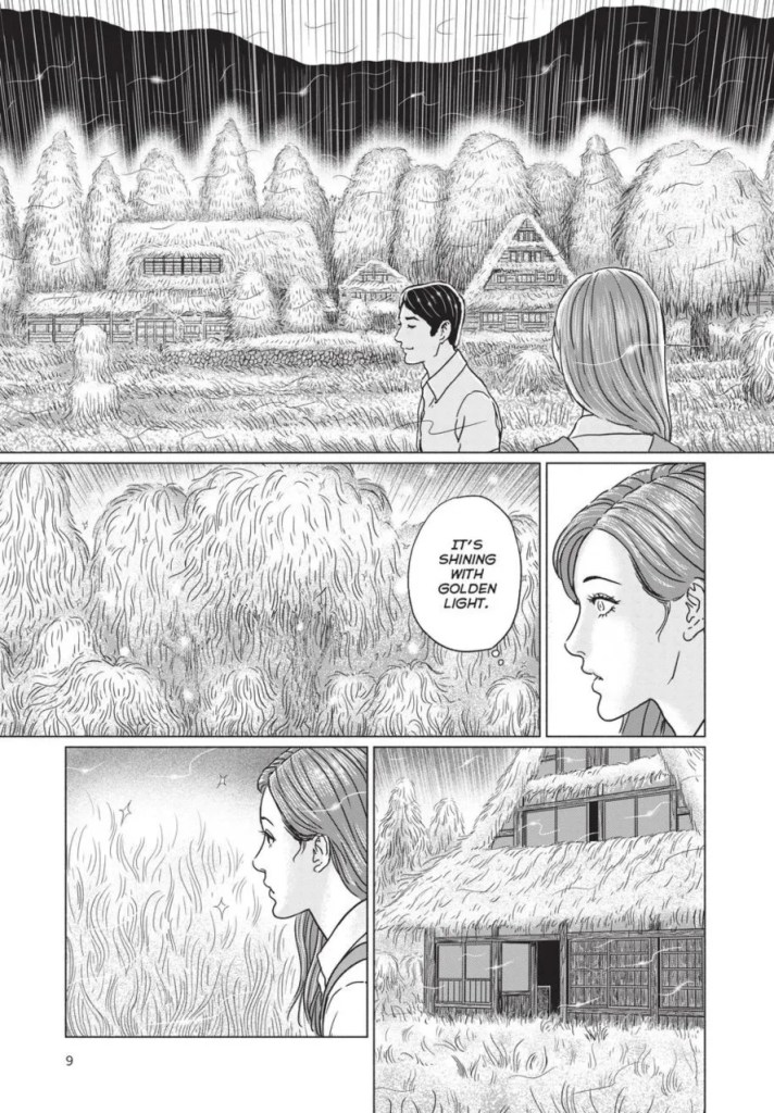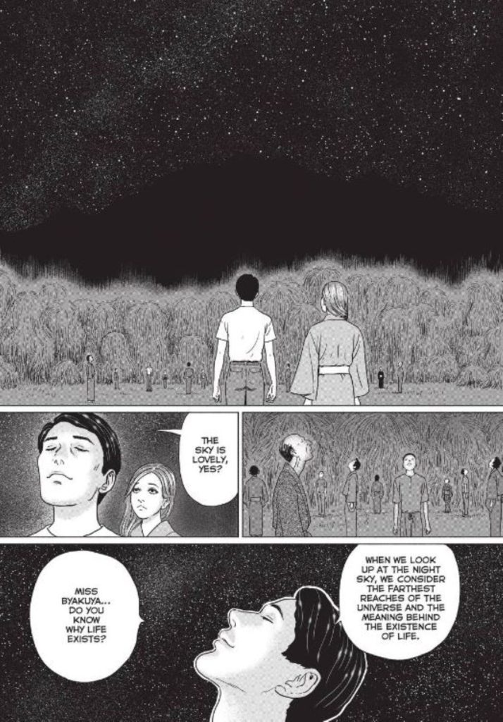 This is one of Ito’s first forays into a more cosmic, unknowable horror. Stories like Uzumaki touched on that unknowable horror, but its basis was something within the earth itself. This time we’re looking more toward the stars and what they hold. There is something ancient hiding at the core of this story, a figure that the villagers at the base of Mount Sengoku briefly glimpse, and its golden threads tie the story together. Coming from Ito, there isn’t much in terms of the body horror much of his famous work is known for. Instead, we have a story that creeps along with that ancient entity in the background. It’s a horror that build and builds these small moments into a realization of the kind of cosmic terror that is peering down at these people trying to scratch at the surface of its machinations.
