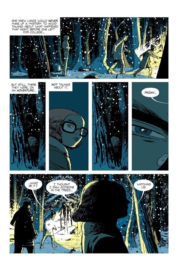 Friday, as it is right now, is easily some of the best illustrative work Martín has put out. And with Vicente on colors, the pages of this story fully envelop the eye. And some of this comes with the idea that nearly every major moment in the story has its own color palette. Much of the story takes place with an interplay between blue and yellow—a contrast that creates a more muted mood as these are primarily utilized in the woods of Kings Hill. But there are interruptions of that palette. A sudden red sky in the middle of the night or a panel of a character with the background a singular color snaps the eye into attention. It is drawn in and enveloped as the yellows and blues blend into reds and purples before this chapter of the story closes. Those specific moments are stitched into a reader’s memory as a result of the colors that become so strongly associated with them.